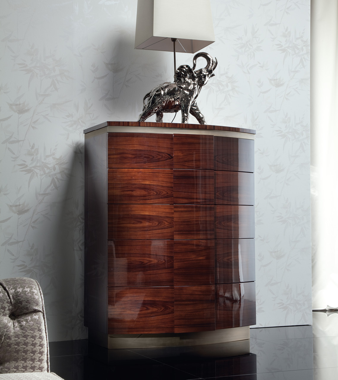 Chest with combination of brazilian rosewood veneer with high gloss polyester finish and bronzed stainless steel details. 5 full extension double drawers with bottom in velvet fabric. Bronzed stainless steel base.