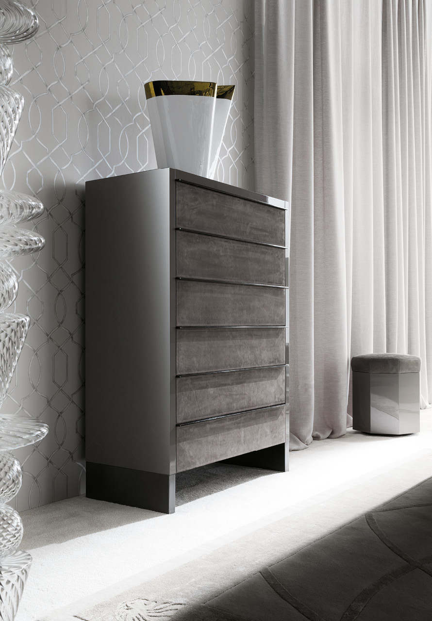 Chest in high gloss polyester grey lacquer. 6 full extension drawers with fronts in natural protected nubuk leather, botton part in velvet fabric. Base, legs and handles in black nickel steel.
