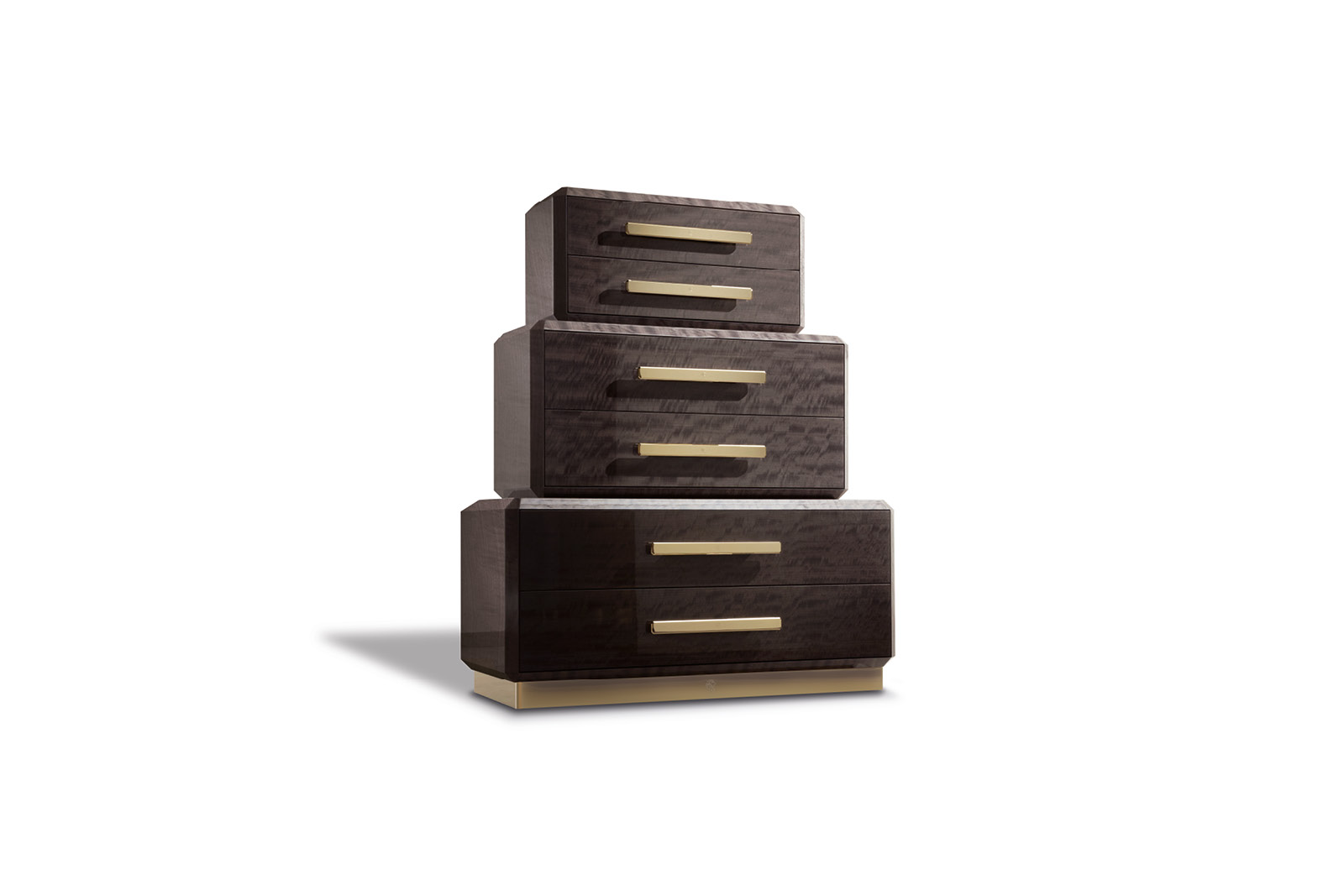 3 steps chest in makorè mahogany veneer with high gloss polyester finish. 6 full extension drawers with bottom part in velvet fabric. Base and handles in light gold chrome stainless steel with Giorgio Collection logo.