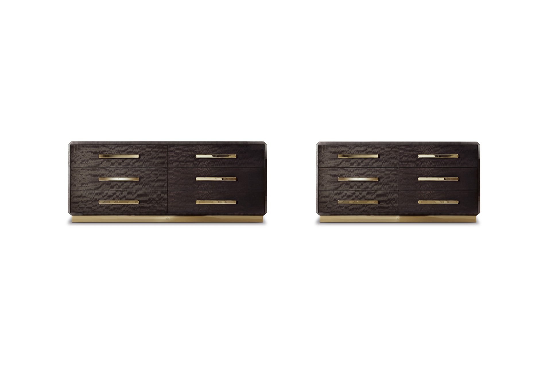 Dresser in makorè mahogany veneer with high gloss polyester finish. Inlaid veneer top, 6 full extension drawers with bottom part in velvet fabric. Base and handles in light gold chrome stainless steel with Giorgio Collection logo.