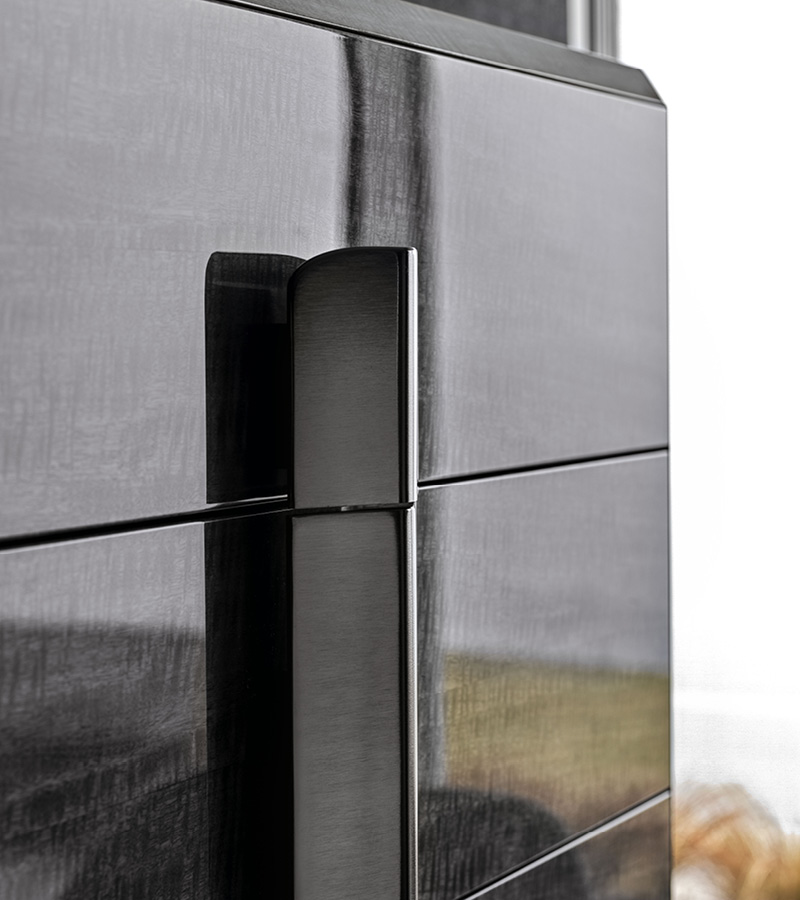 Chest in Madagascar figured Mowinghi veneer in high gloss polyester finish. Base and handles in satin black nickel stainless steel. 6 full extension drawers with bottom part in velvet fabric.