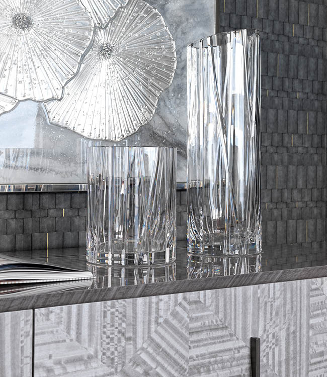 Dresser in Tasmanian curly Eucaliptus veneer with high gloss polyester finish. 6 full extension drawers with bottom part in velvet fabric. Base and handles in satin grey nickel stainless steel. Top and sides with insert in satin grey nickel stainless steel.