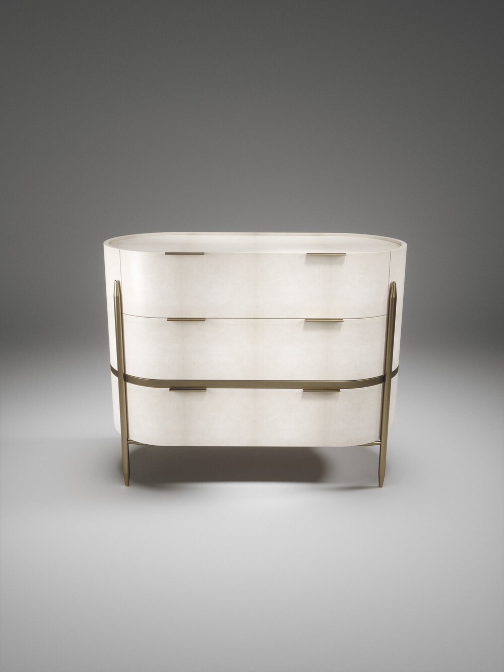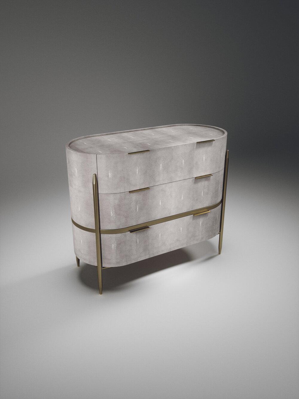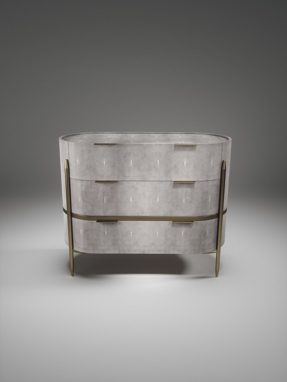 The Dandy oval chest of drawers by Kifu Paris is an elegant and a luxurious home accent, inlaid in cream shagreen with bronze-patina brass details. This piece includes 3 drawers total and the interiors are inlaid in gemelina wood veneer. Available in light grey shagreen and parchment and as a rectangle version and as a bedside table. This piece is designed by Kifu Augousti, the daughter of Ria and Yiouri Augousti.