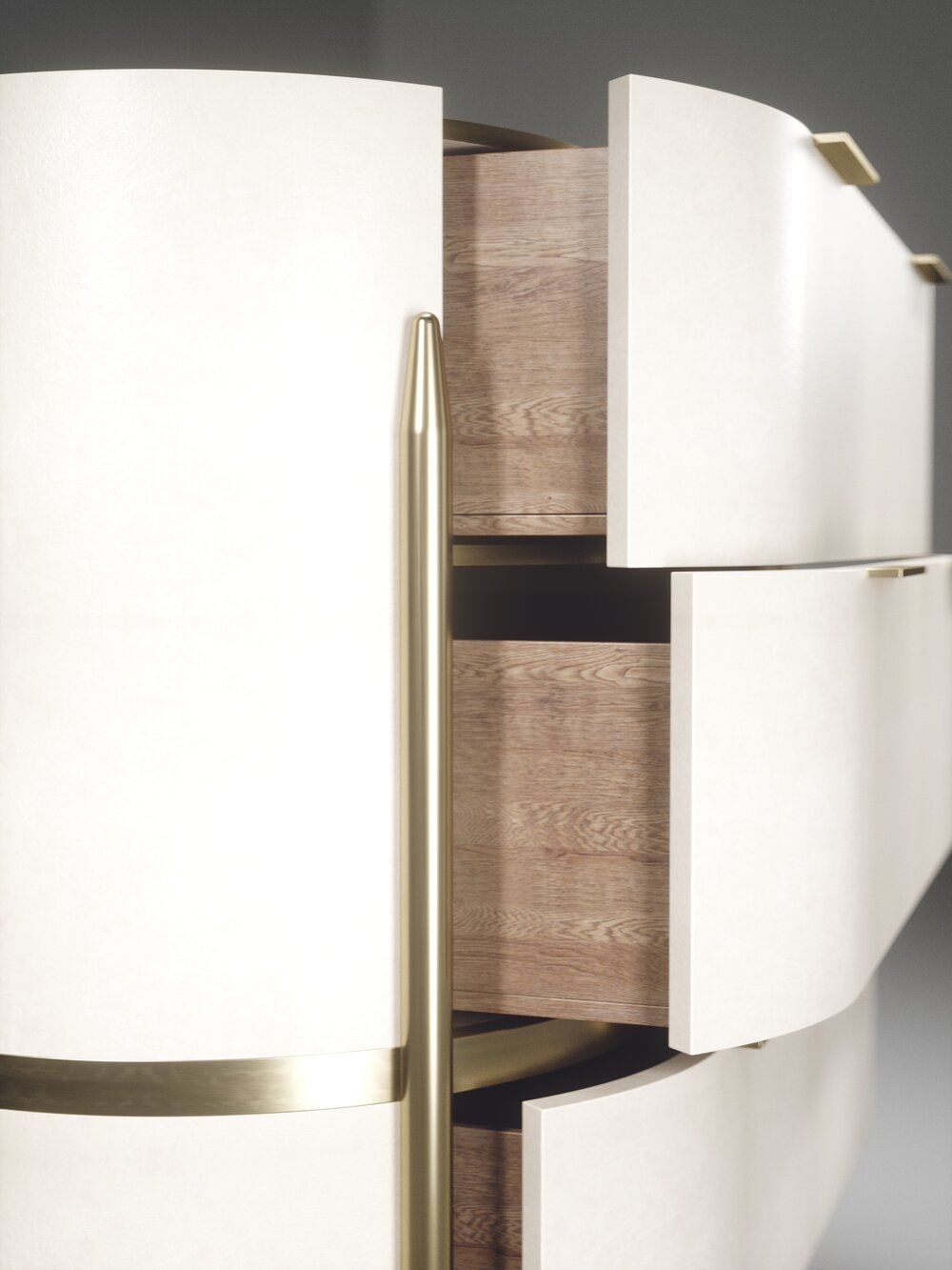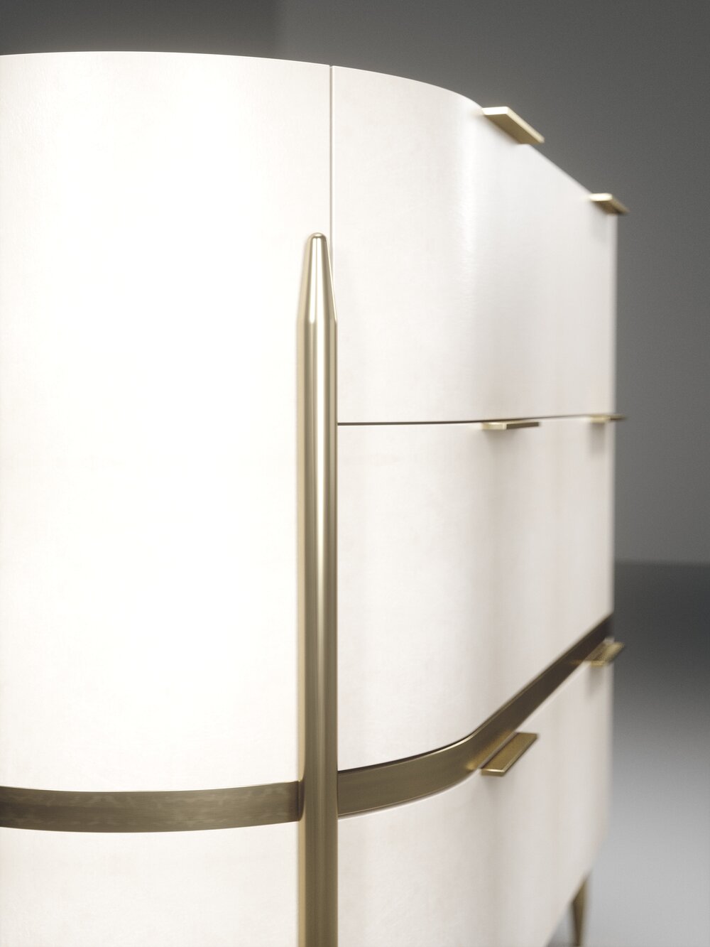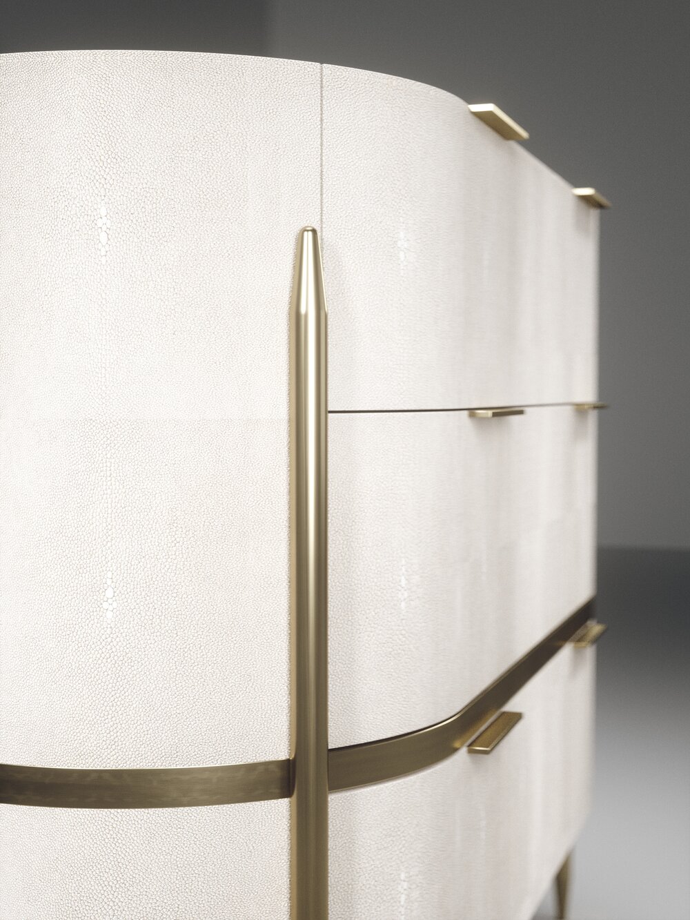 The Dandy oval chest of drawers by Kifu Paris is an elegant and a luxurious home accent, inlaid in cream shagreen with bronze-patina brass details. This piece includes 3 drawers total and the interiors are inlaid in gemelina wood veneer. Available in light grey shagreen and parchment and as a rectangle version and as a bedside table. This piece is designed by Kifu Augousti, the daughter of Ria and Yiouri Augousti.