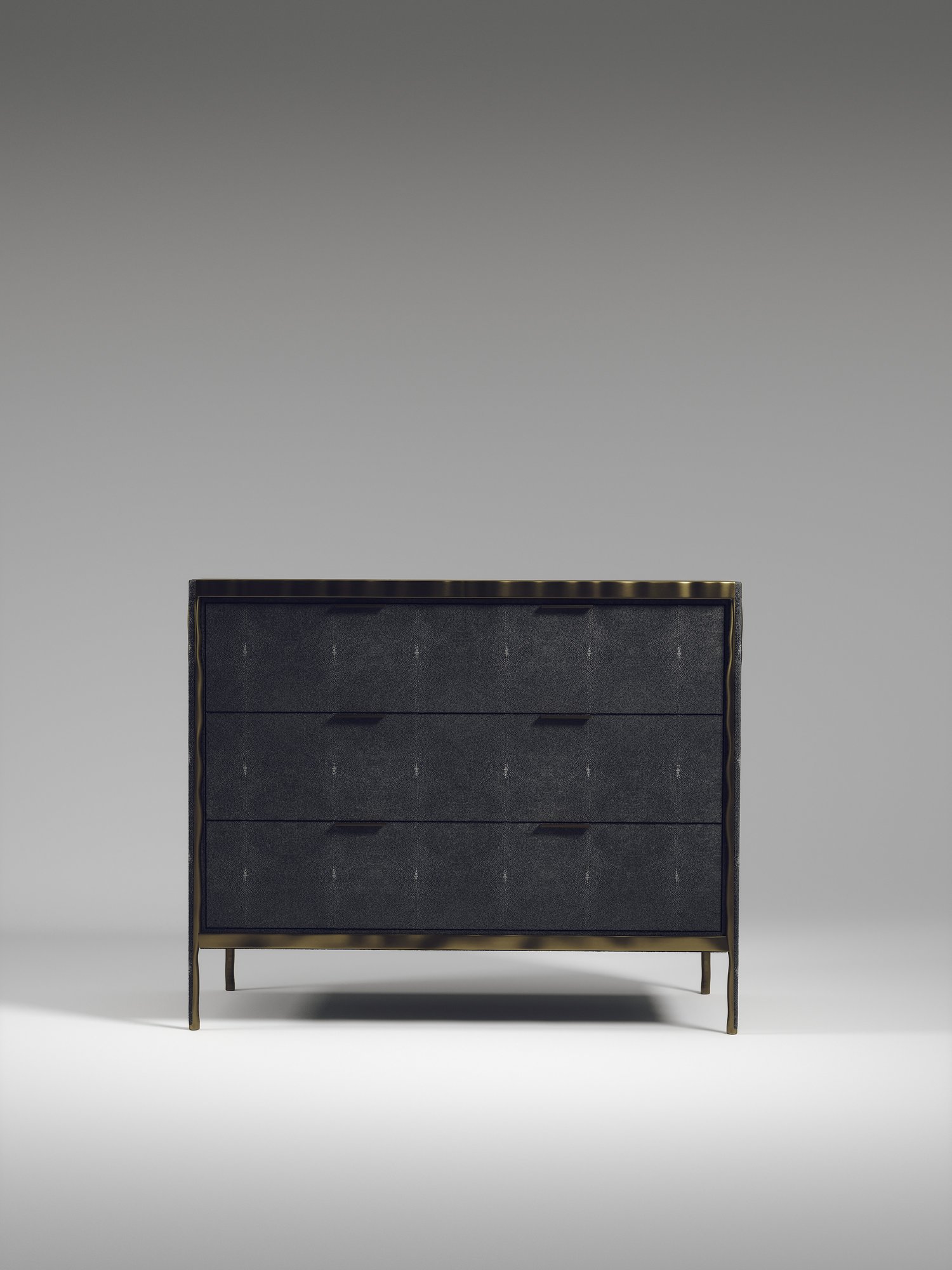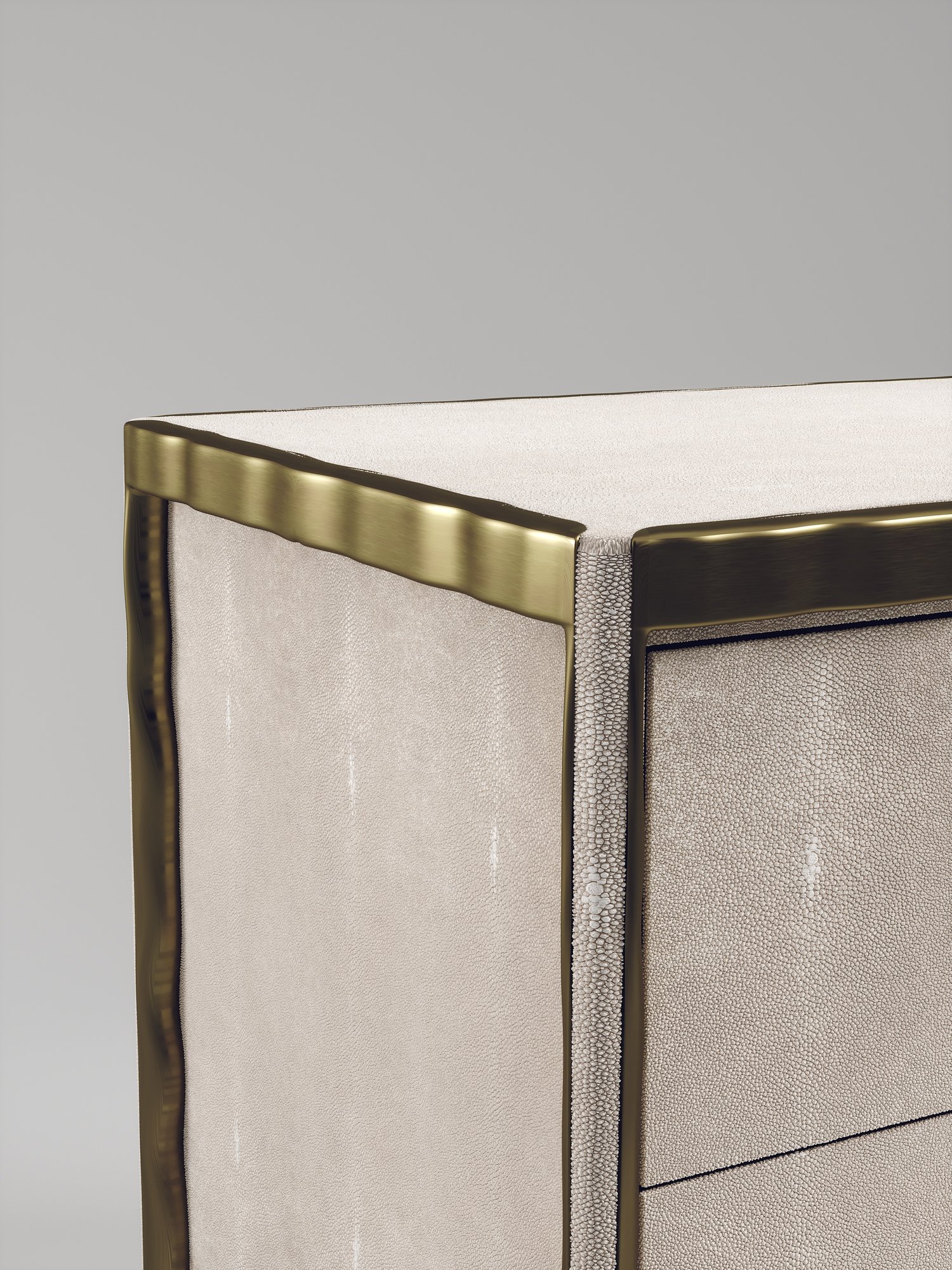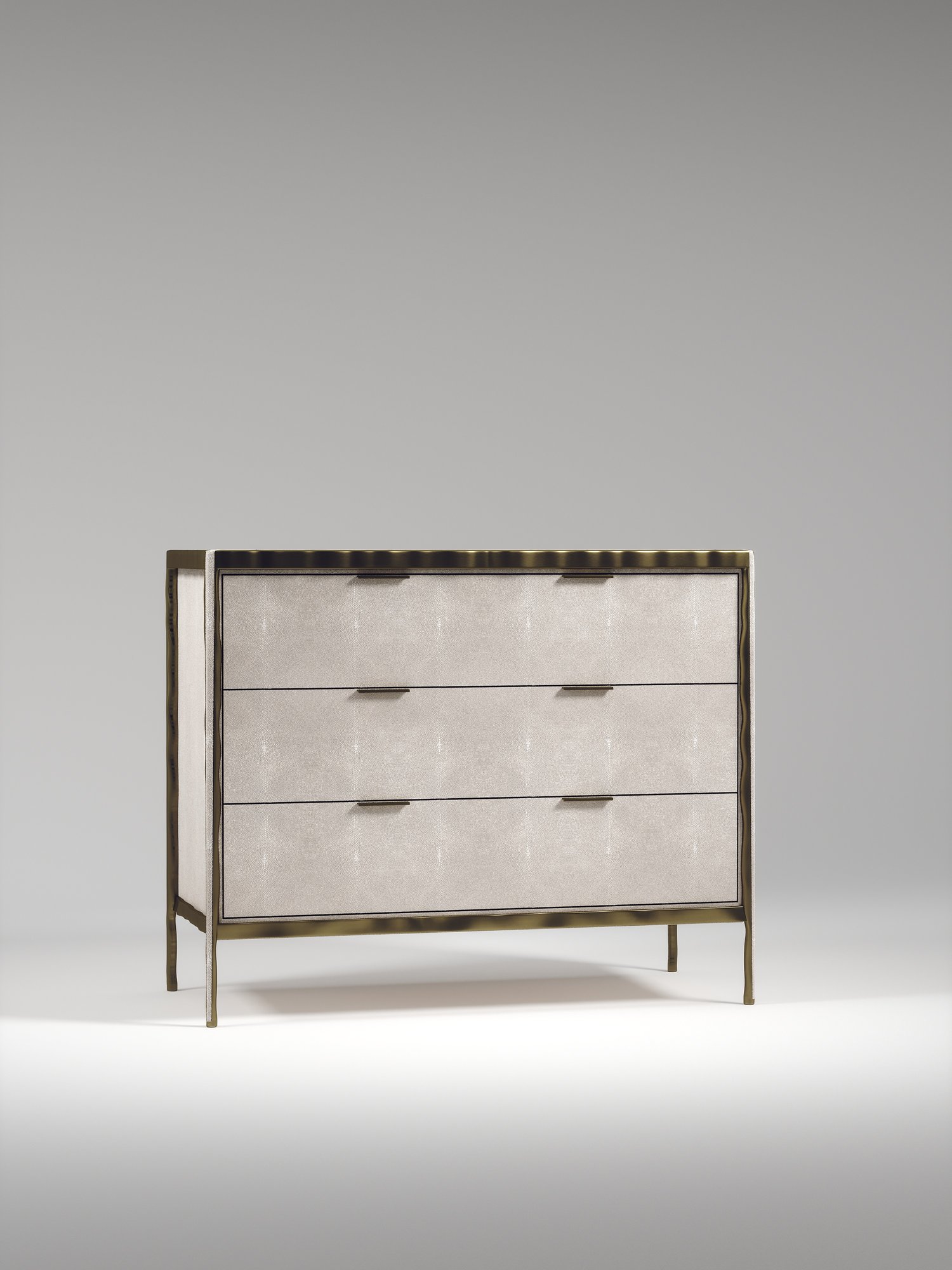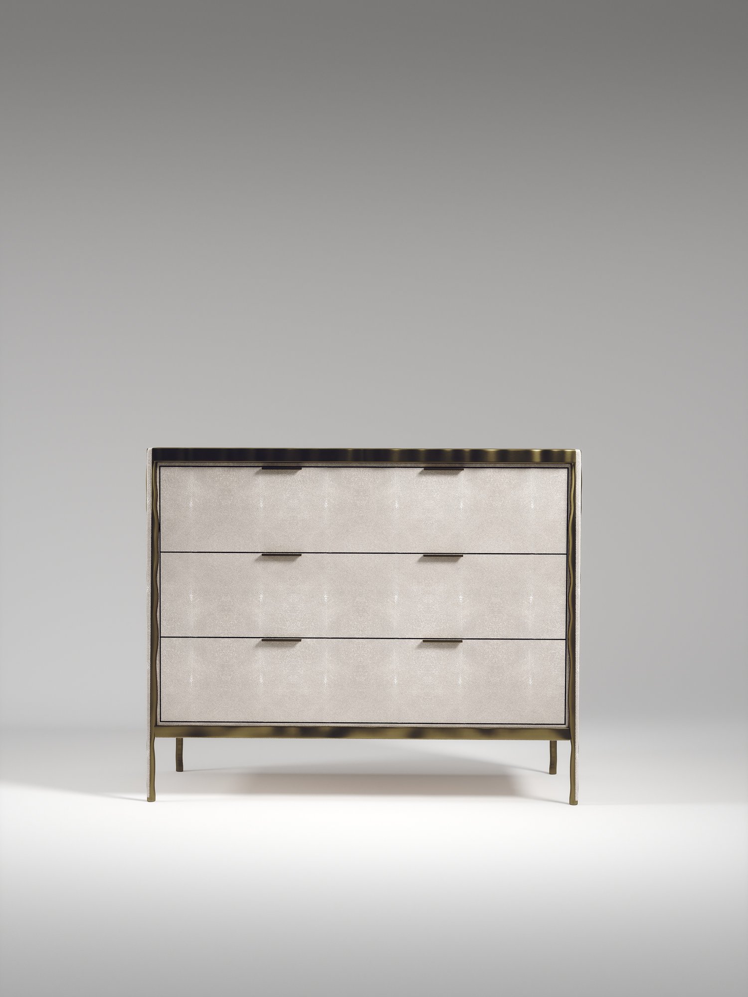 The Melting Chest of Drawers by R&Y Augousti is an elegant piece for any space. The cream shagreen inlaid piece is classic, but accentuated by their signature organic melting bronze-patina brass frame. This sideboard includes 3 drawers with 6 flat handles. This piece is part of the Melting Capsule. Available in other finishes.