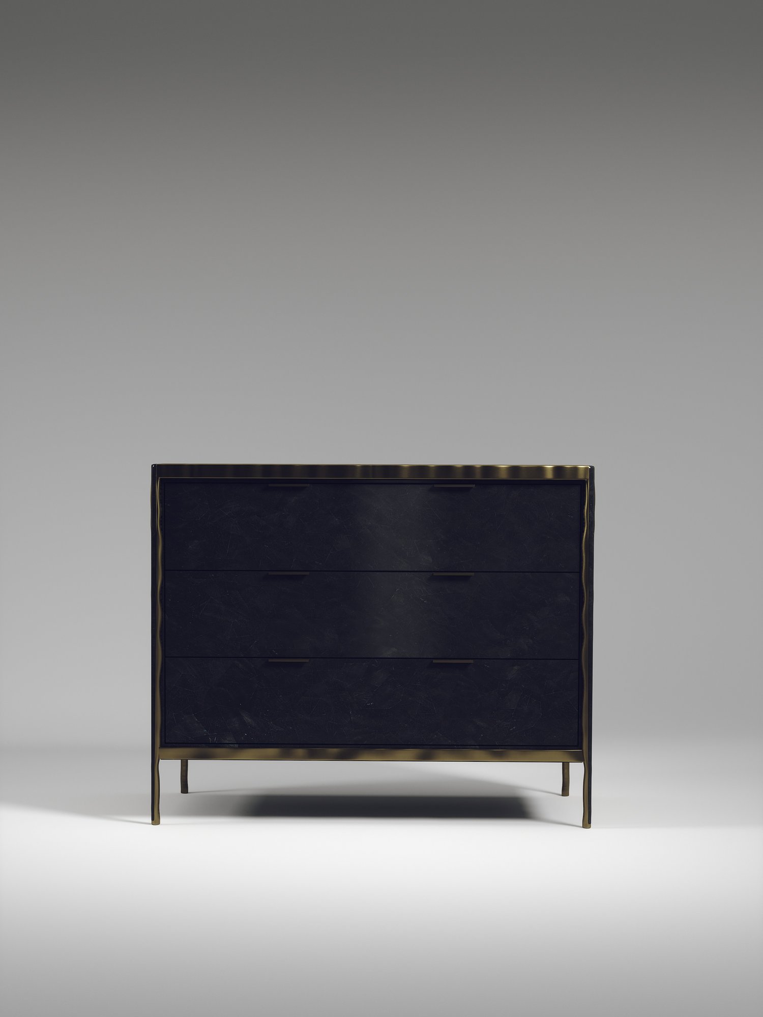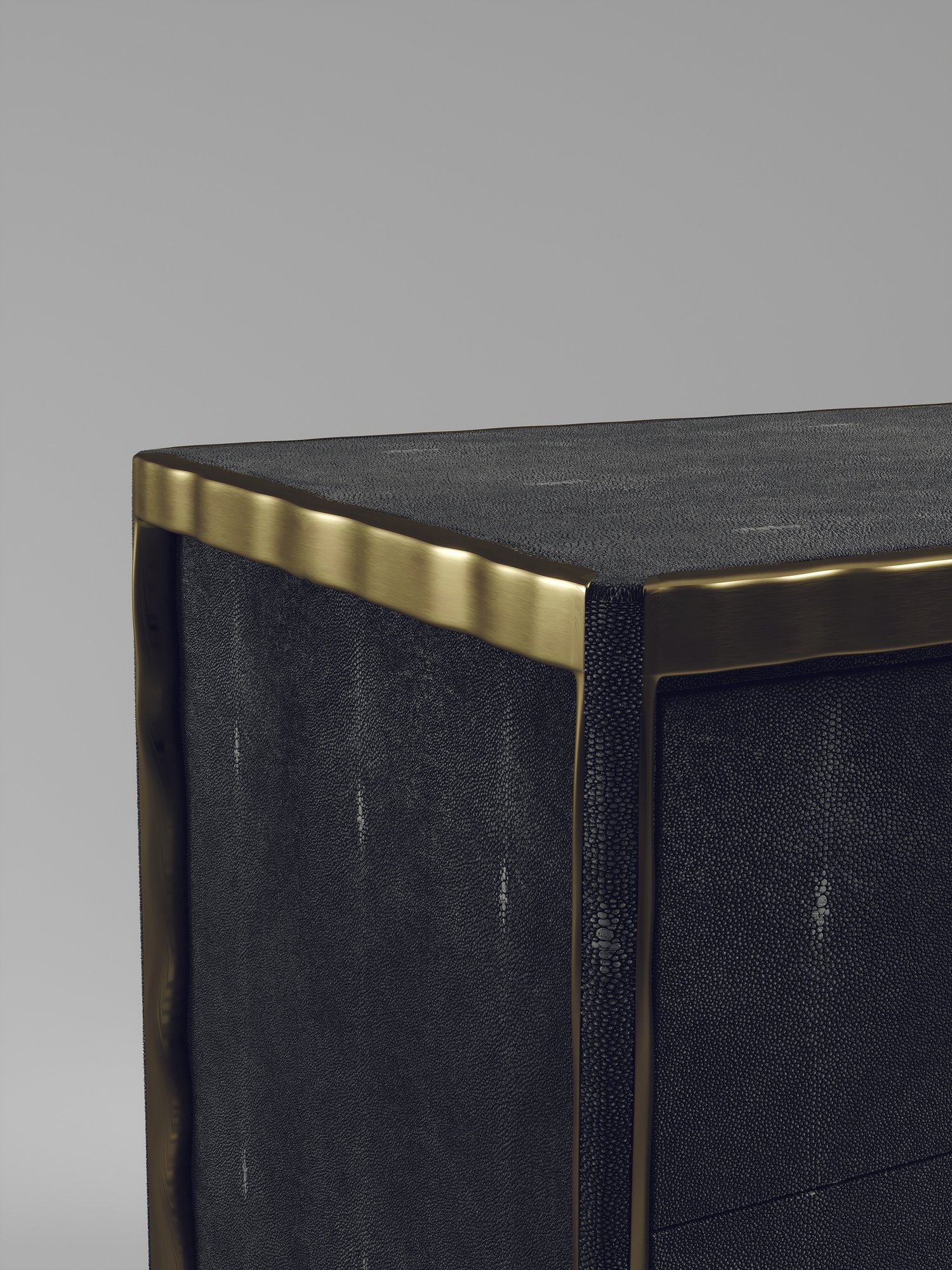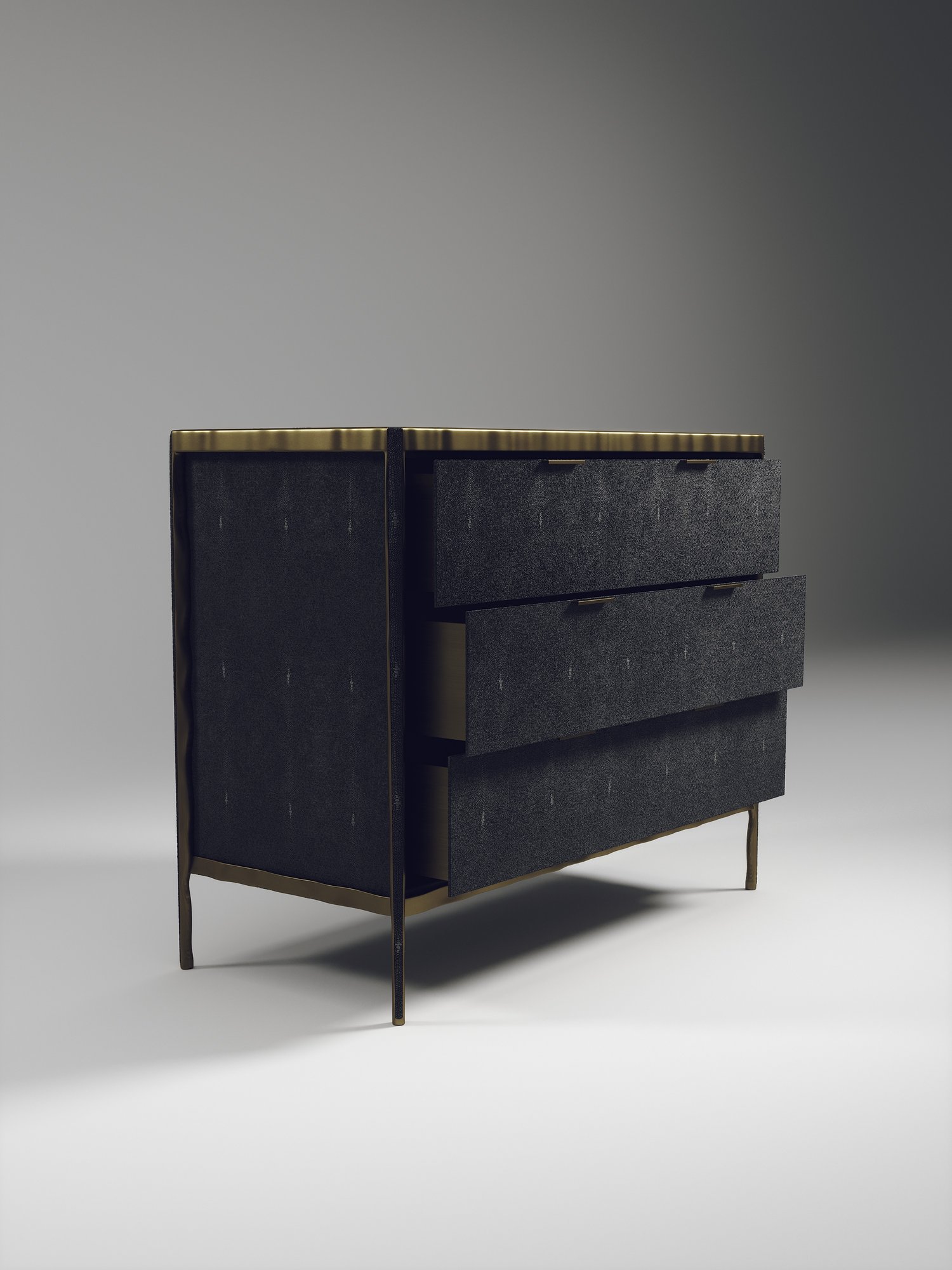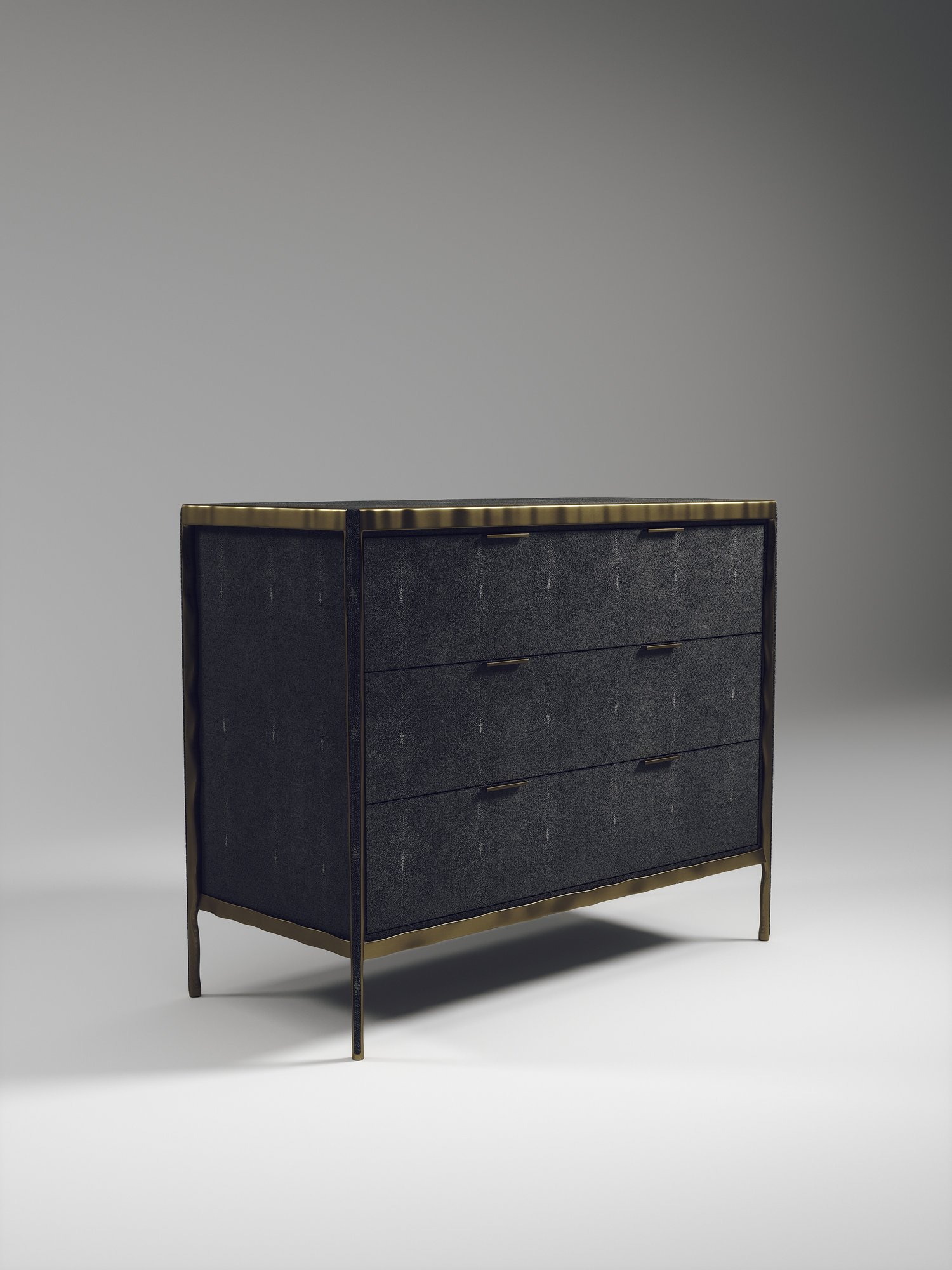 The Melting Chest of Drawers by R&Y Augousti is an elegant piece for any space. The cream shagreen inlaid piece is classic, but accentuated by their signature organic melting bronze-patina brass frame. This sideboard includes 3 drawers with 6 flat handles. This piece is part of the Melting Capsule. Available in other finishes.