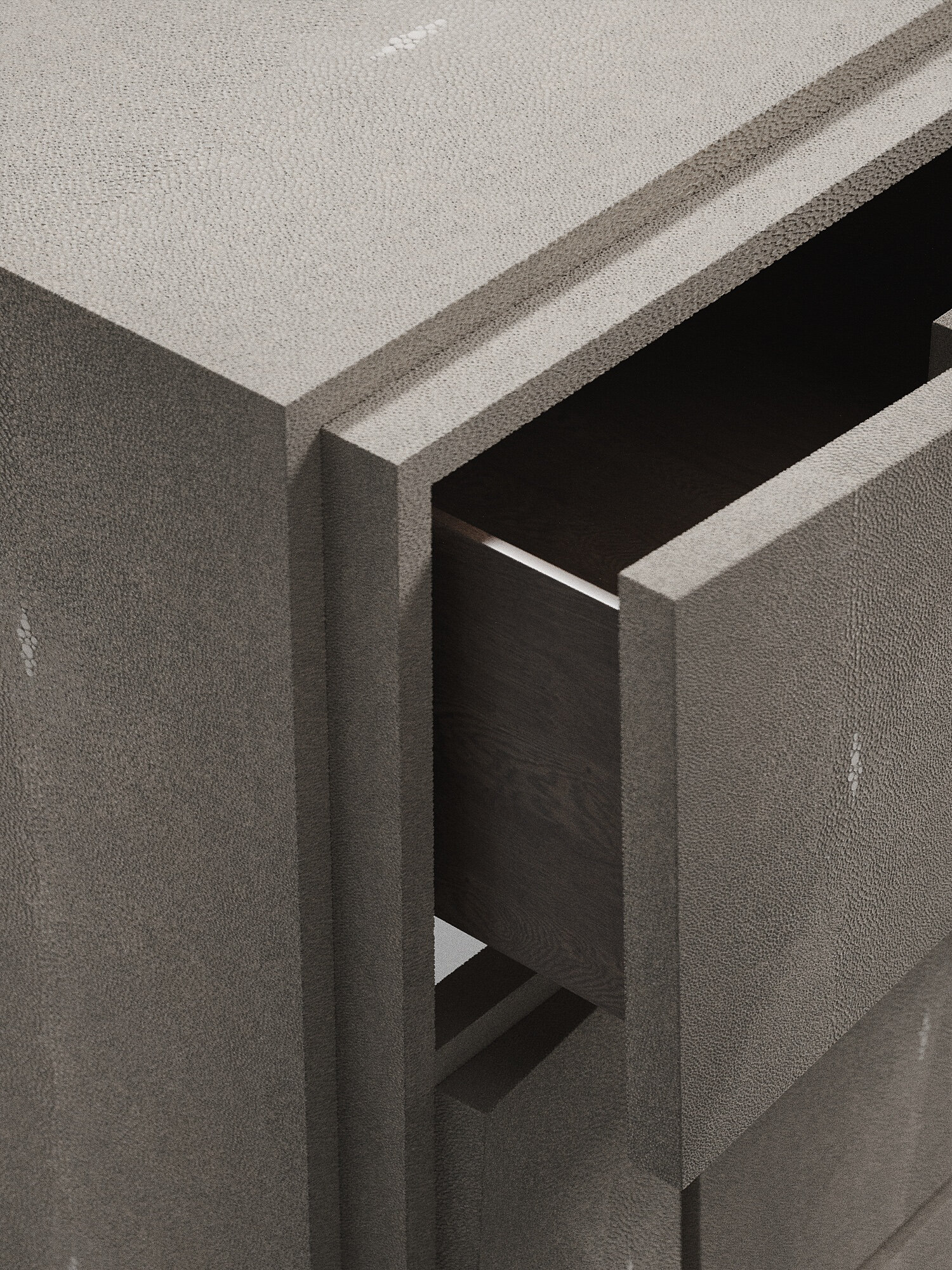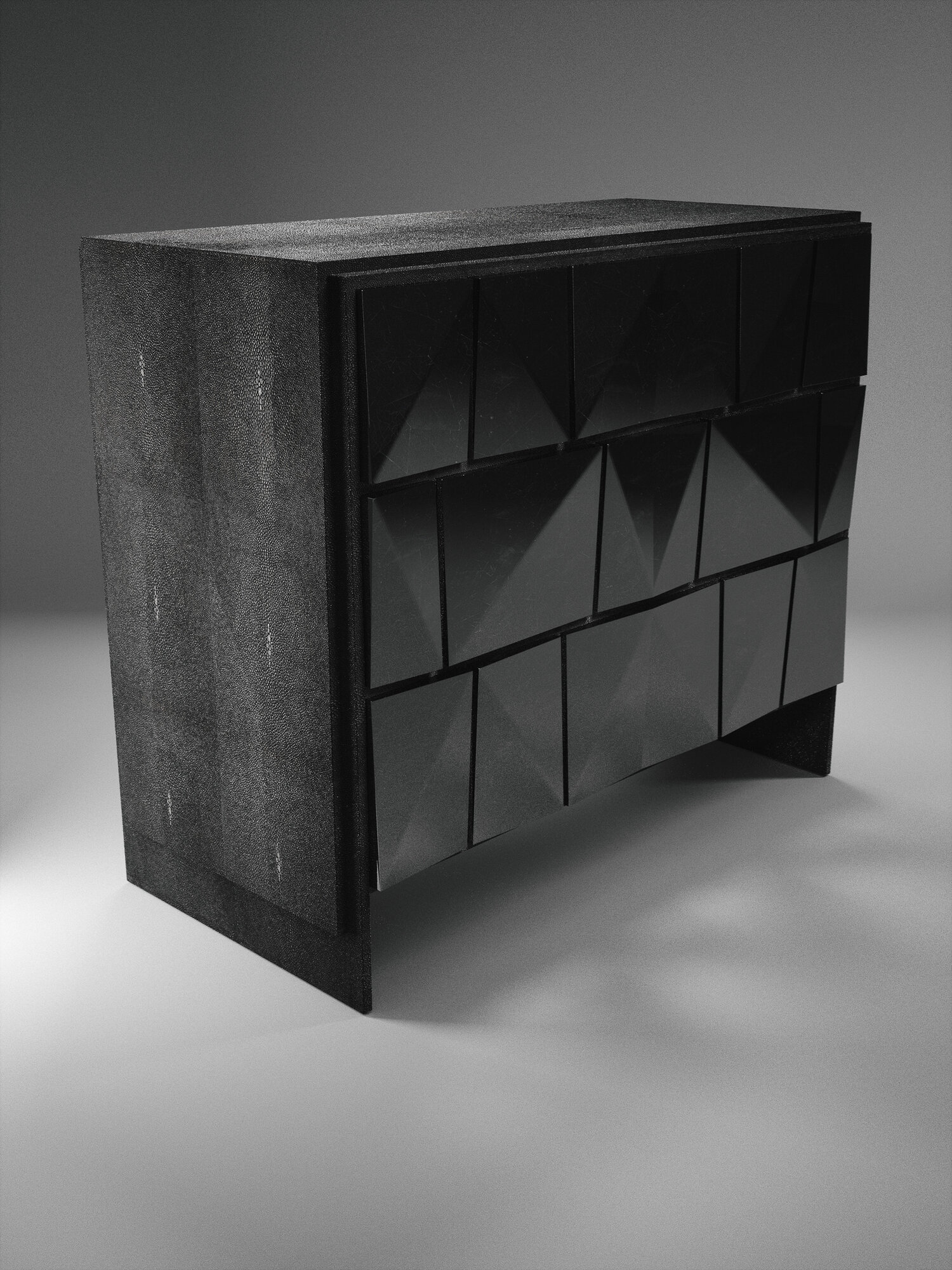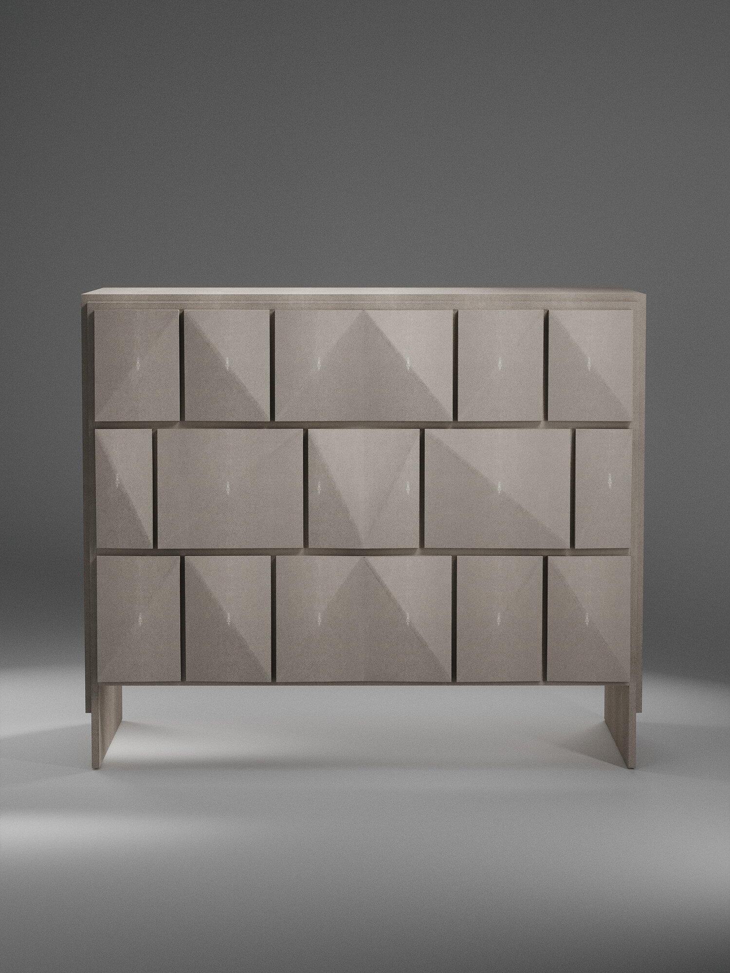 The Rhomboid chest of drawers in cream shagreen is a beautifully detailed piece with its dramatic beveled "rhomboid" drawers. This storage cabinet includes 3 drawers total. Available in other finishes, see images at end of slide. The finish of the shagreen is authentic as it is hand-dyed and the designer calls the finish look: "antique natural shagreen."