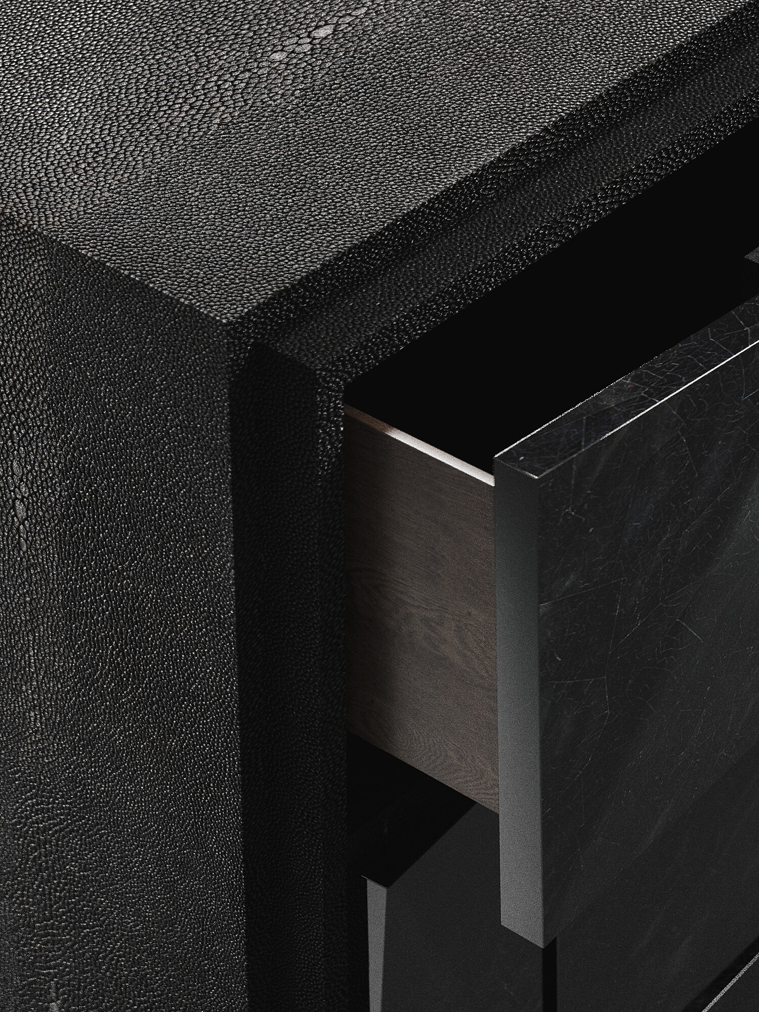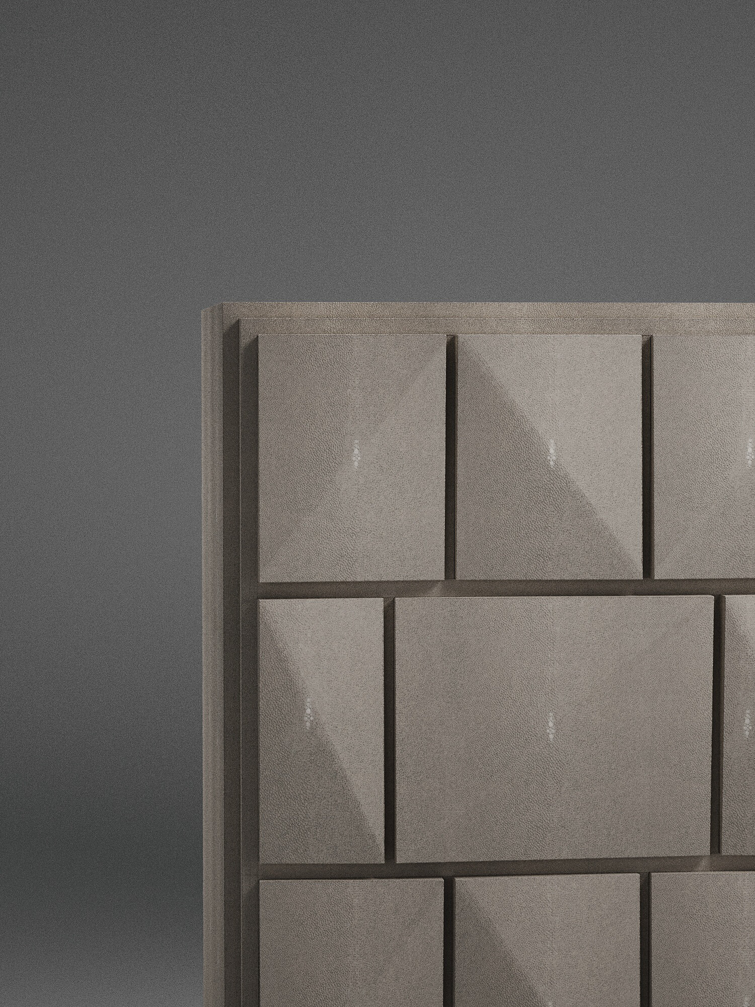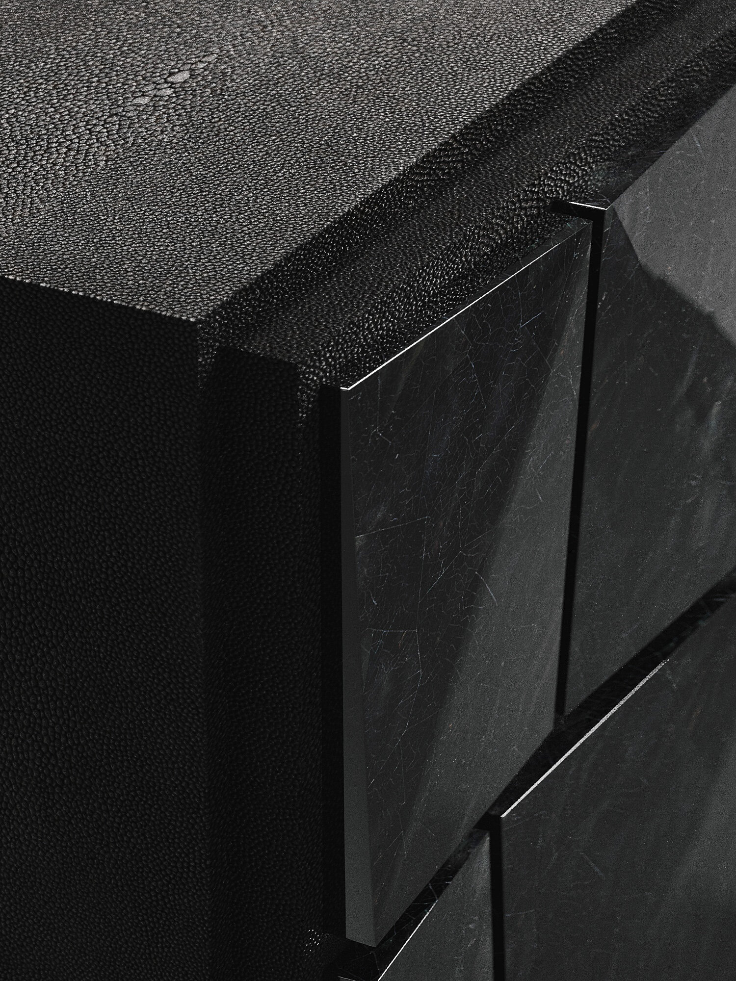 The Rhomboid chest of drawers in cream shagreen is a beautifully detailed piece with its dramatic beveled "rhomboid" drawers. This storage cabinet includes 3 drawers total. Available in other finishes, see images at end of slide. The finish of the shagreen is authentic as it is hand-dyed and the designer calls the finish look: "antique natural shagreen."