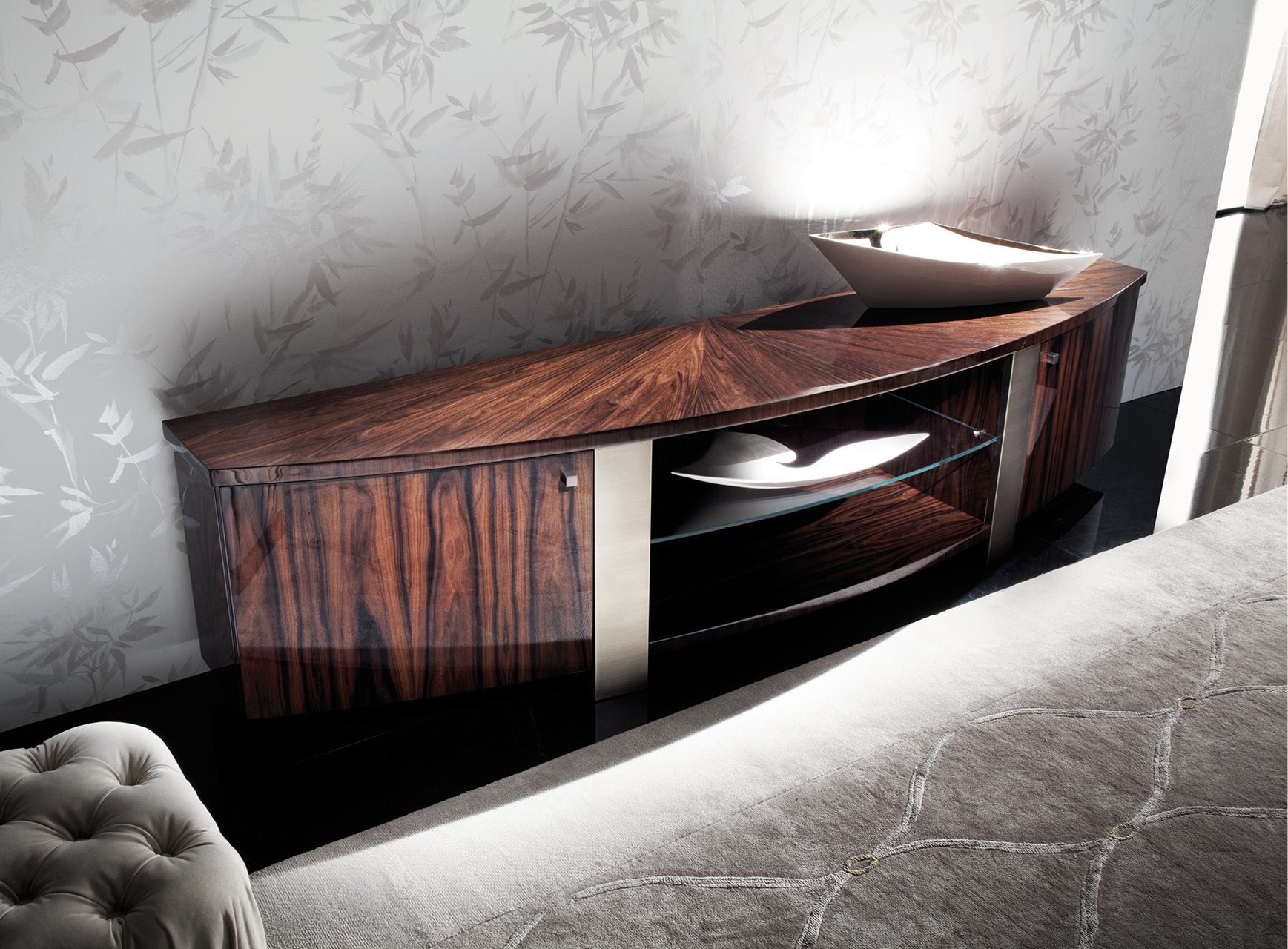 Base for plasma T.V. unit in Brazilian rosewood veneer with high gloss polyester fi nish. 2 doors and 1 open space. 1 center glass shelf and 2 lateral glass shelves Sunbursted veneer top with “Giorgio collection” inserted brass logo. Base, and handles in bronzed stainless steel.