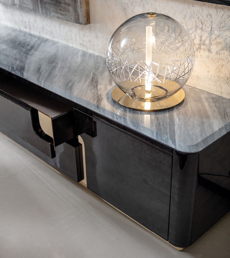 Base for TV unit in Black Bubinga burl veneer with high gloss polyester finish. 2 handles and details in light gold chrome stainless steel.