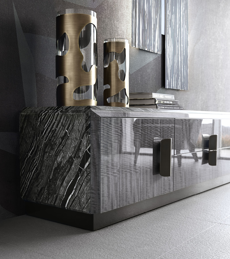 Base for TV unit in Madagascar figured Mowinghi veneer with high gloss polyester finish. 4 handles and base in satin black nickel stainless steel. Top and sides in Black Kenya marble.