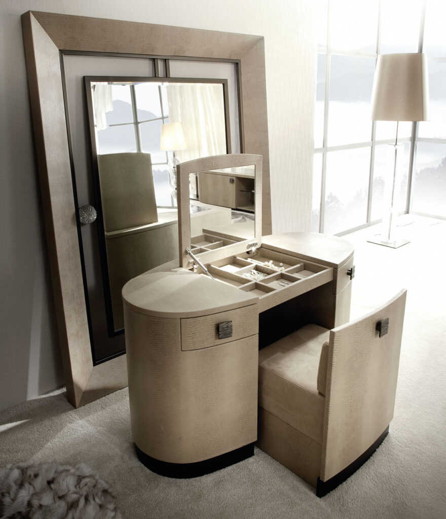 Upholstered chair for vanity desk with wheels and back panel in armadillo printed leather, seat and back pillow in nubuk leather. Back handle in bronzed brass.