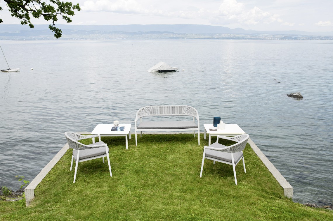 Clever lounge is perfect for enjoying an aperitif or an outdoor lunch. A spacious cushion in water-resistant acrylic fabric can be added to its spacious seat.