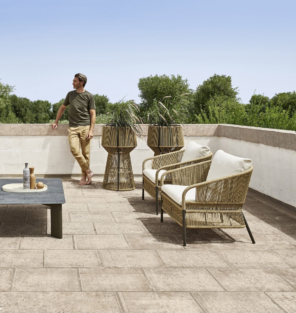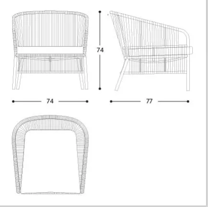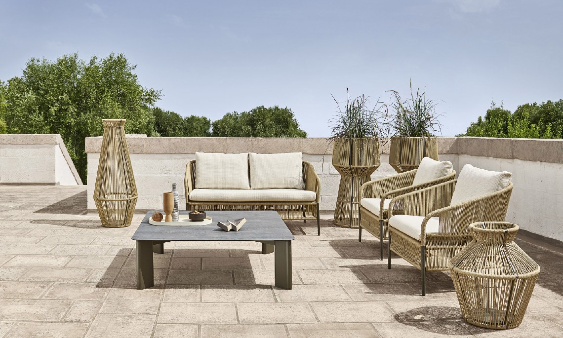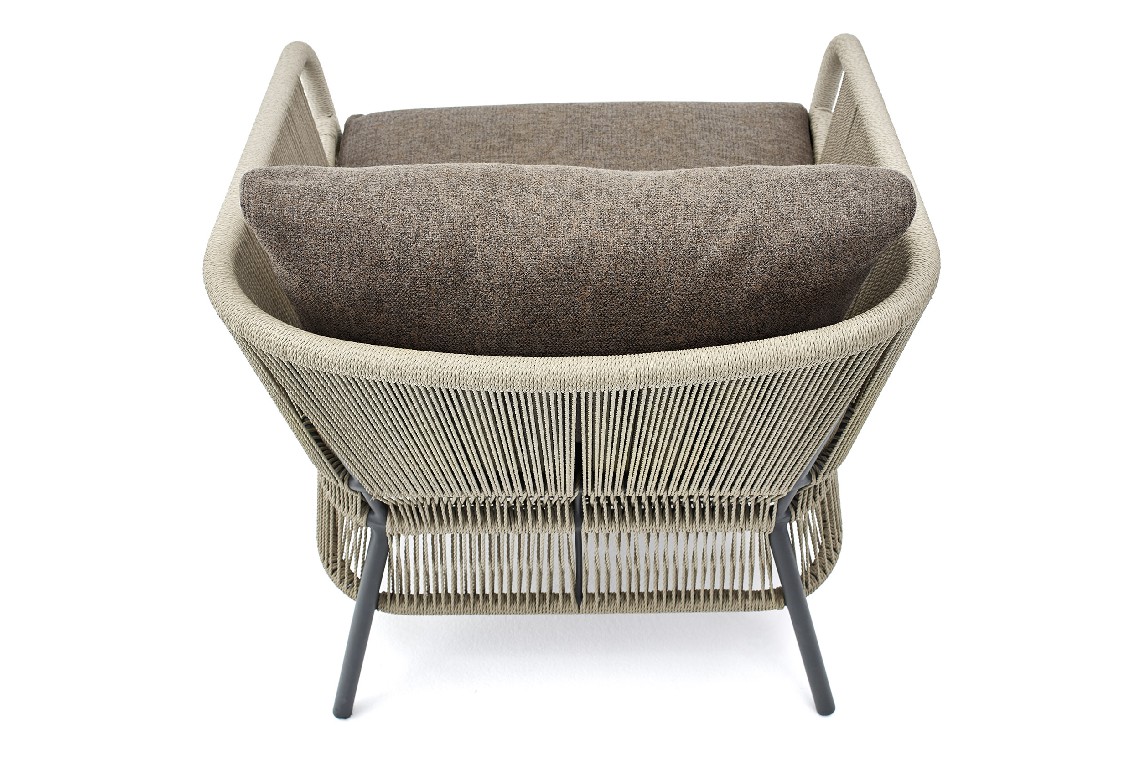 The lounge armchair of the Cricket collection stands out for the hand weaving of the rope backrest. Its twisting is a precious element of craftsmanship, a refined detail that enhances its shape and design.