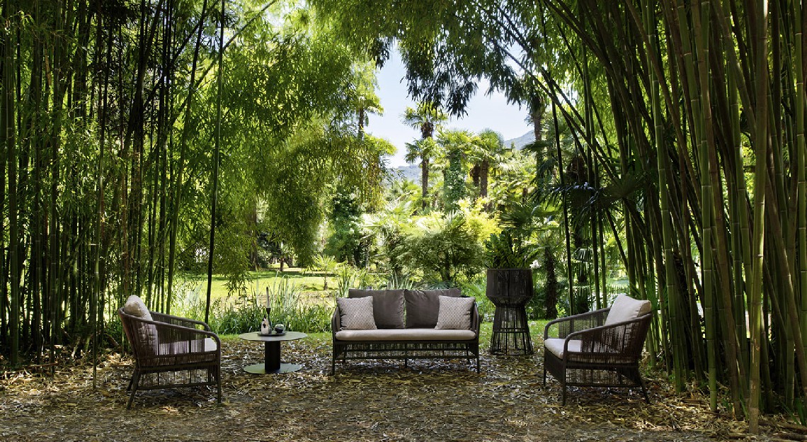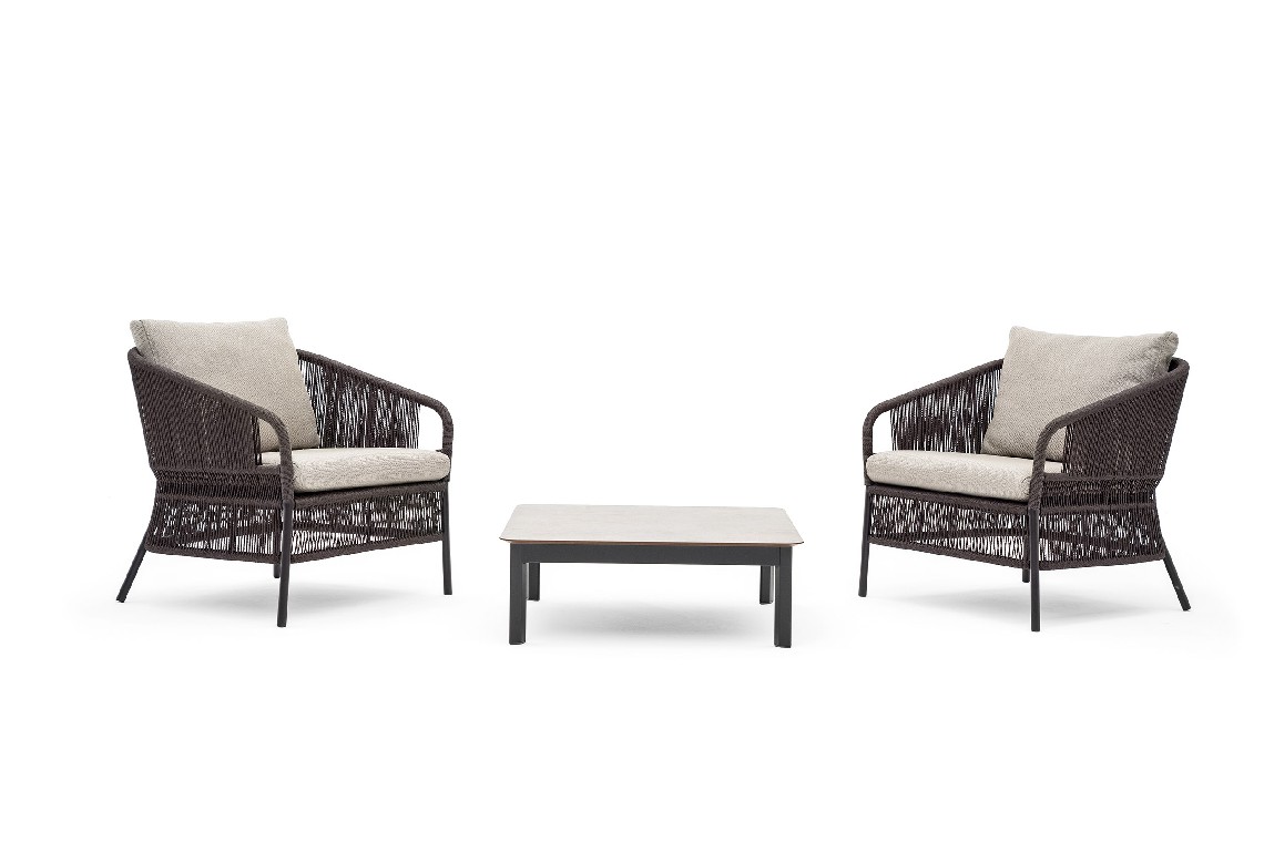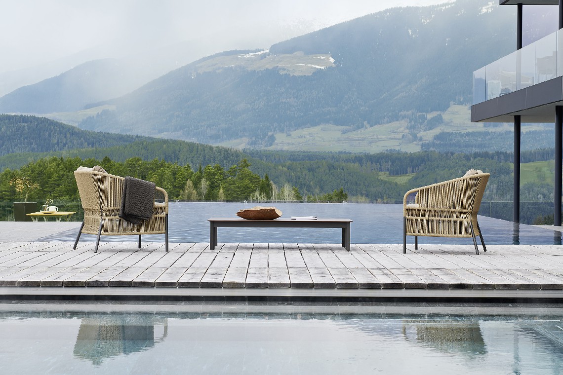 A spacious cushion on the seat and a softer one on the back make this armchair inviting, chosen by many architects and designers to furnish domestic and contract outdoor environments.