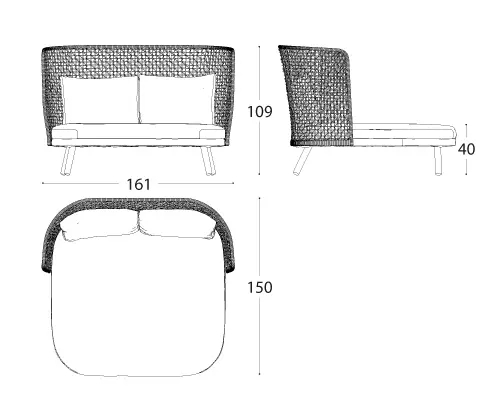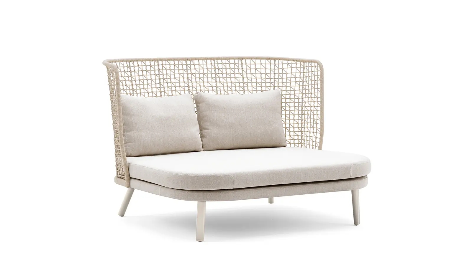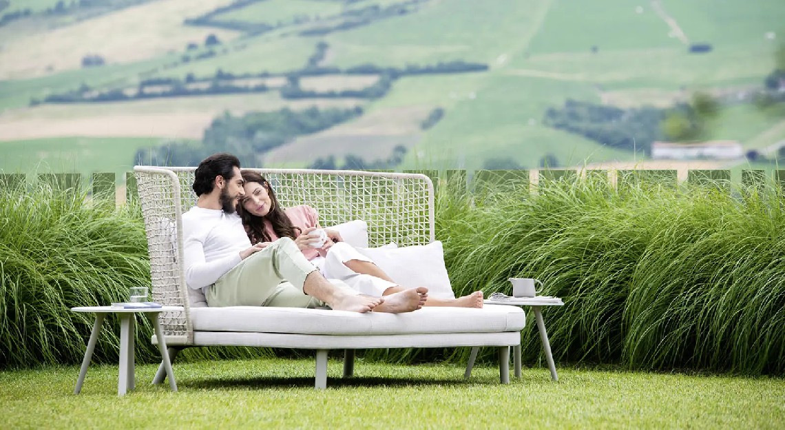 The particular weaving that characterizes the entire Emma collection finds its highest expression in the high backrest of this daybed and an unprecedented cocooning effect. With its soft and curvilinear design, it fits perfectly into any outdoor context, both residential and contract, becoming the protagonist.