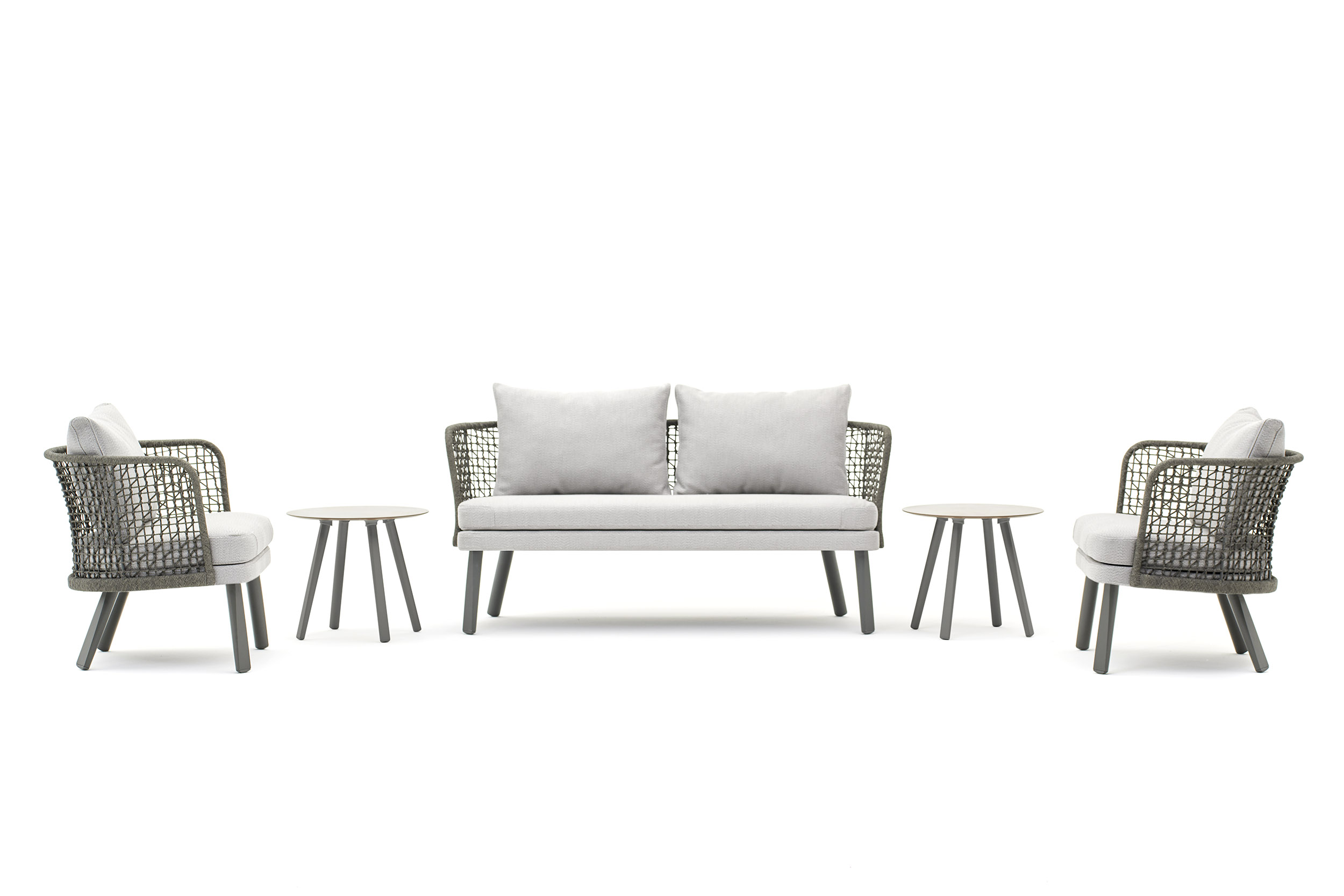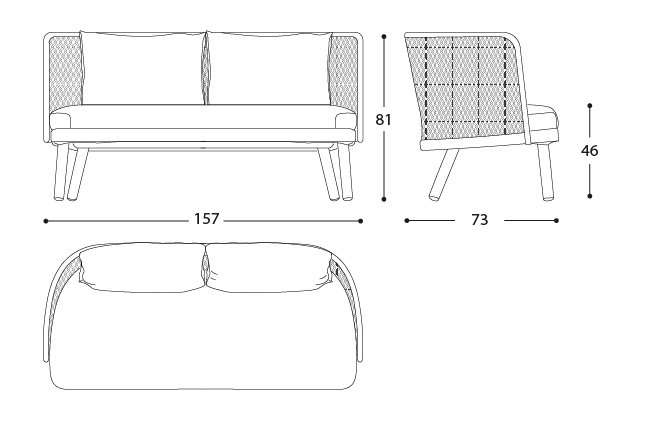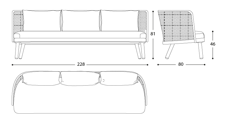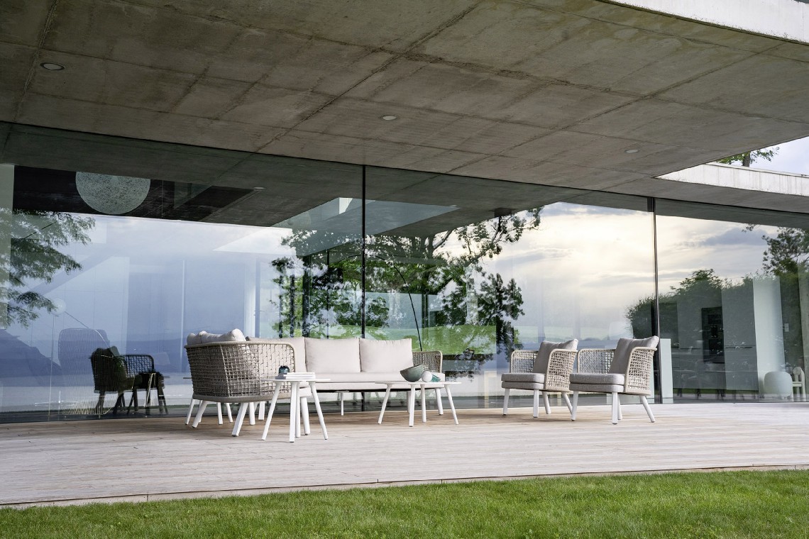 The large family of Emma products includes two or three-seater sofas. The elegant weaving of the backrest, a distinctive feature of the entire collection, is handmade in synthetic rope.