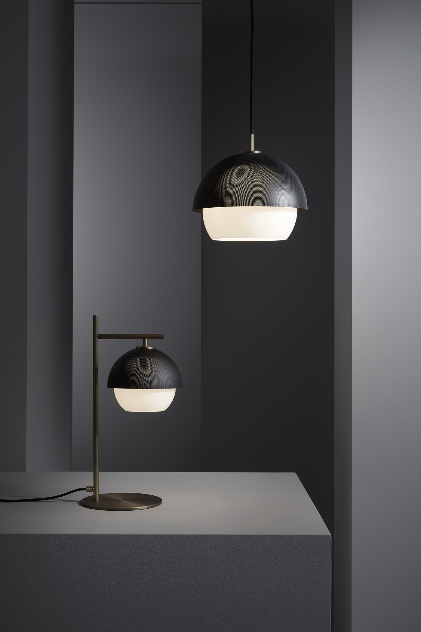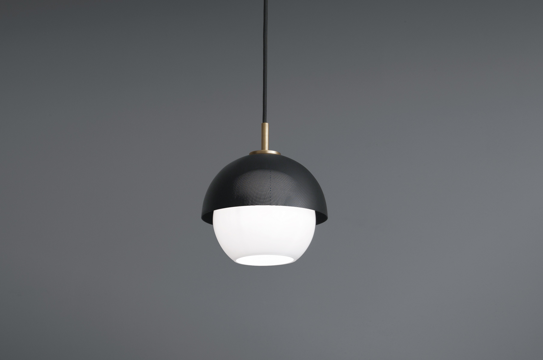 Suspended lamp with diffused light. Light or dark burnished brass structure with matte gold or matte black perforated metal lampshade. White Murano blown glass diffuser.