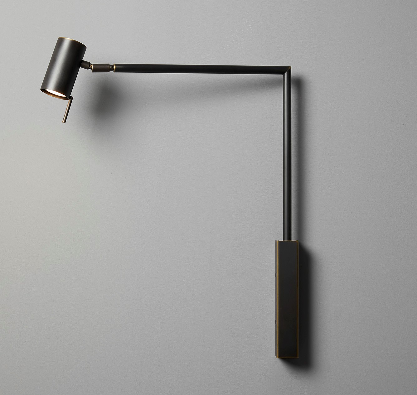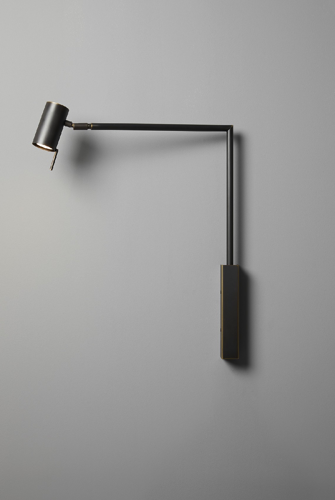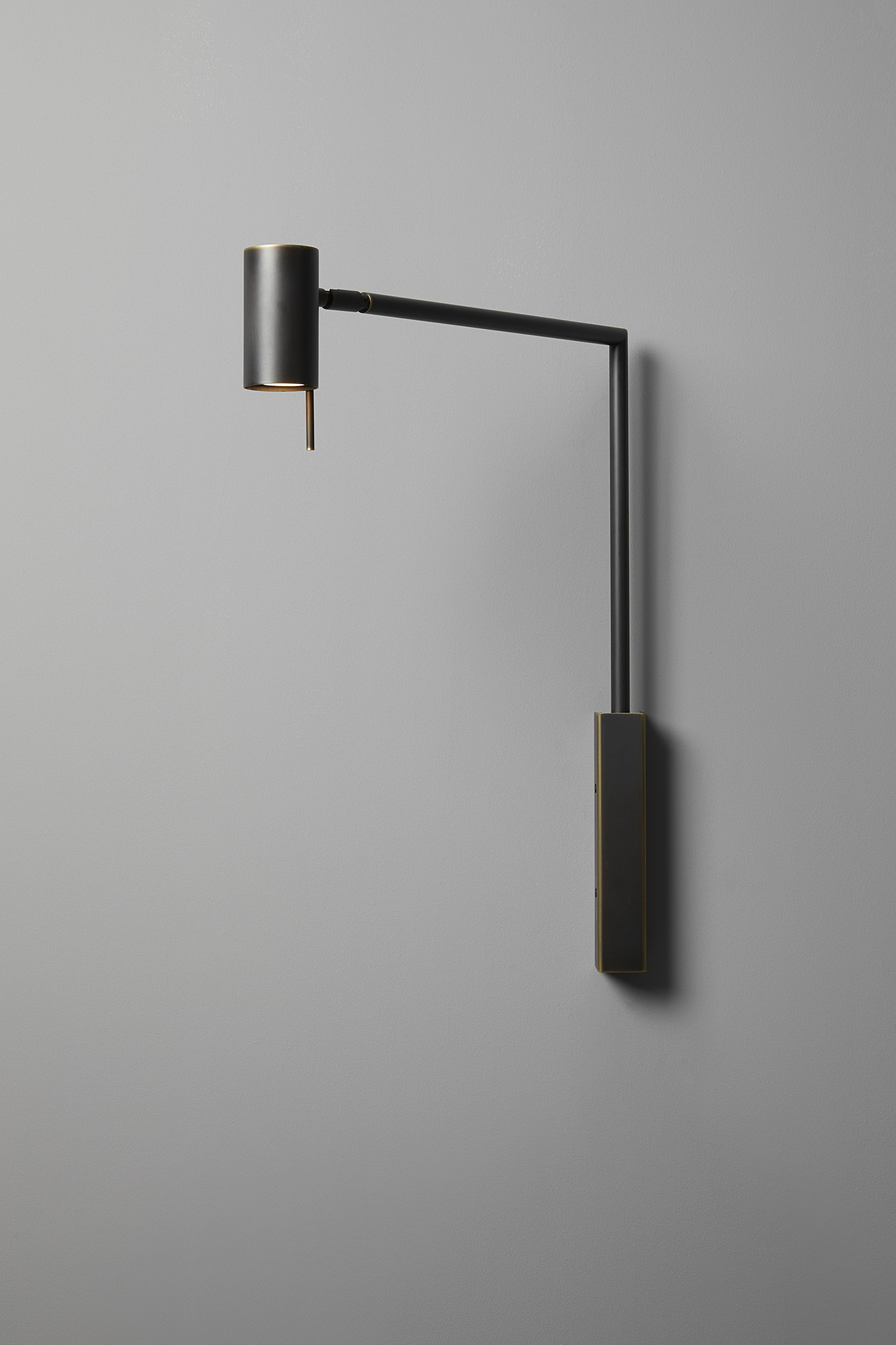 Wall lamp with directional light. Dark burnished brass or matte black nickel and polished black nickel structure and adjustable joint.