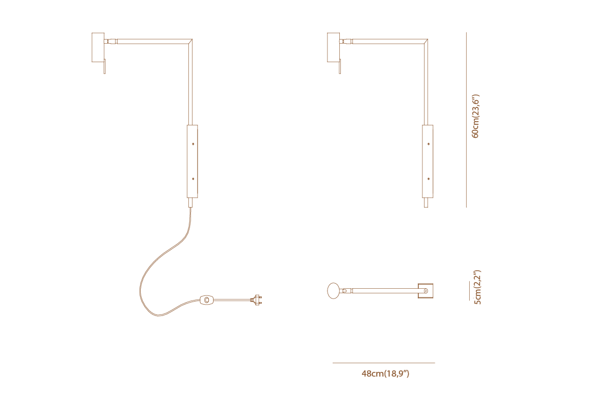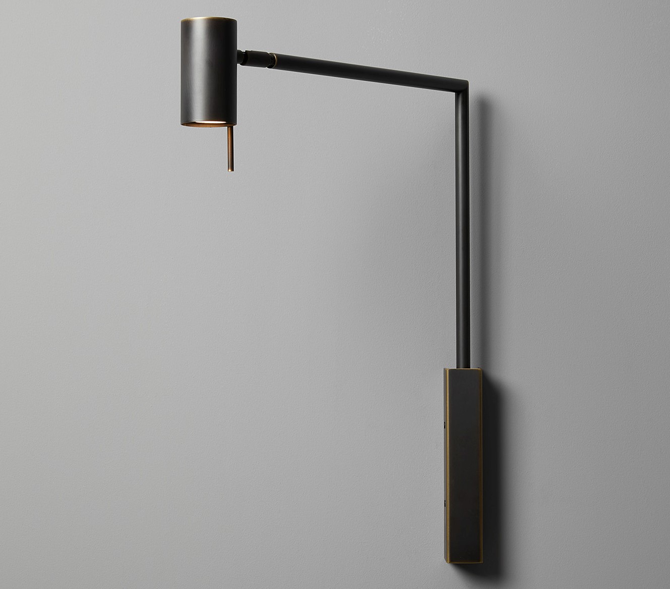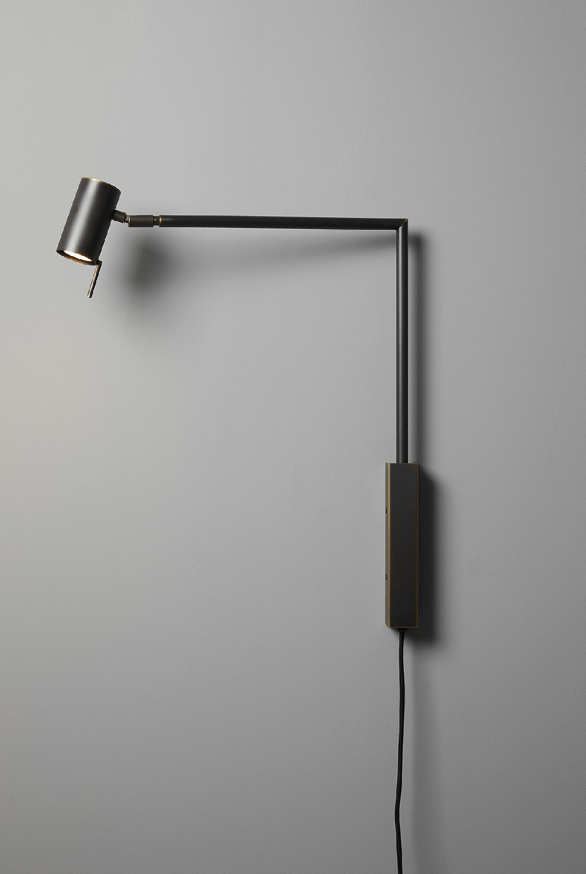 Wall lamp with directional light. Dark burnished brass or matte black nickel and polished black nickel structure and adjustable joint.