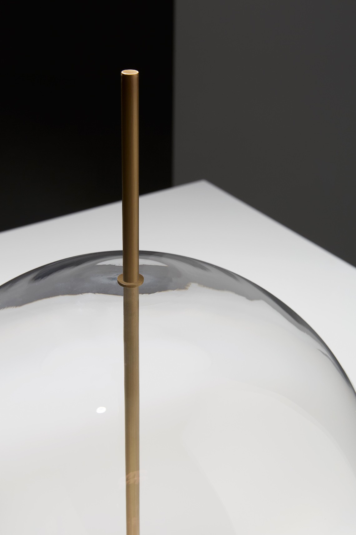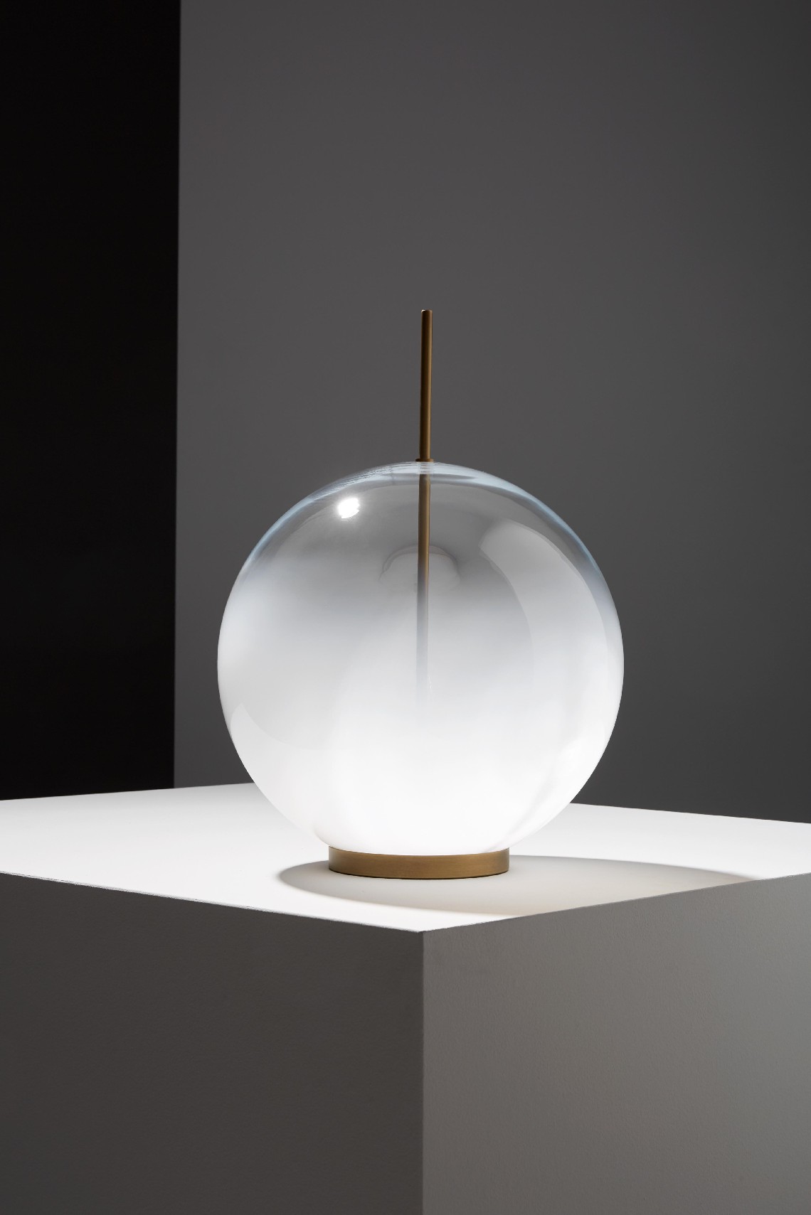 Table lamp with diffused light. Natural burnished brass structure and white blending blown glass diffuser.