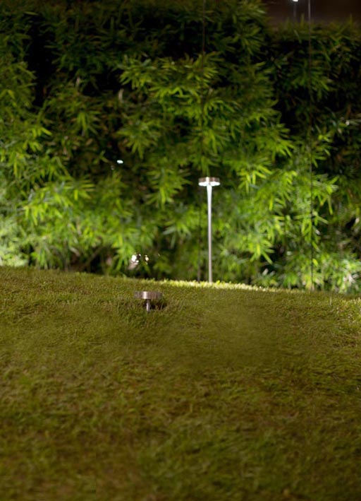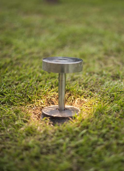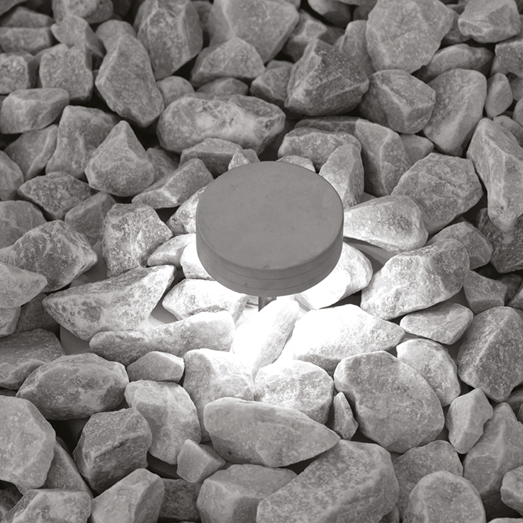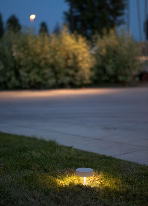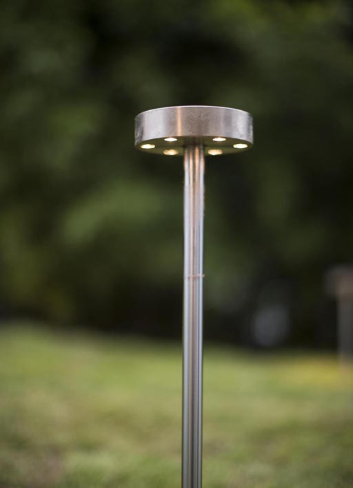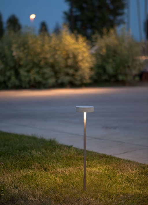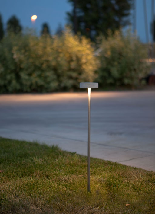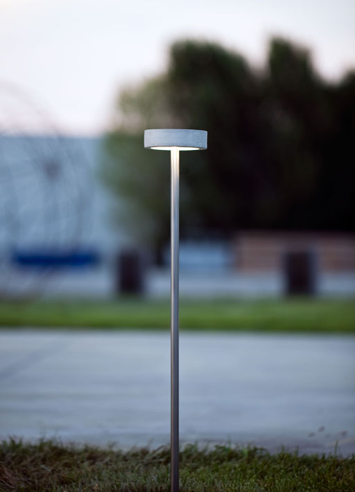 floor-standing light fitting for outdoor use, made of AISI 316L steel and aluminium. it consists of a diameter ?90mm/3.5” h.17mm/0.6” IP65 diffuser and 600mm/23.6” rod. equipped with a stake for ground installation, constant current power supply not included, to be installed remotely. wired with 3000K 6,1W 640lm led source. finishes: antique brown, night black, scurodivals and silver grey.