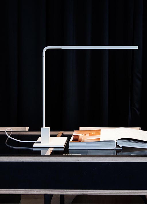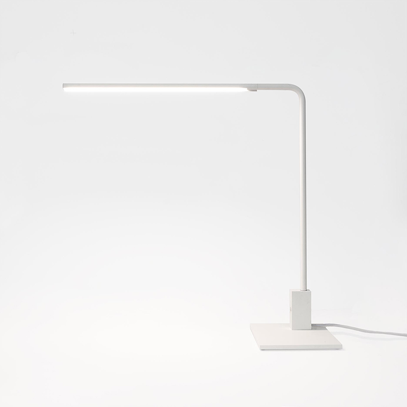 dry location rated table lamp for indoor use. made of powder coated oxidized extruded aluminium profile. consisting of a tubular profile diameter ?13mm/0.5’’ h.508x500mm/20x19.7’’, adjustable by 300° on the horizontal axis and by 300° on the vertical axis, fixed on a 160x160x8mm/6.3x6.3x0.3’’ base through a rectangular support containing on/off touch sensor and usb port. wired with a 3000K Ra95 7.2W 780lm linear led source, equipped with extruded frosted polycarbonate diffuser. 120V 50-60Hz power supply with plug included, with 2000mm/78.7’’ power cable. finishes: bianco V or nero55.
