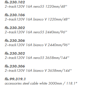 track system for indoor use. it consists of an extruded oxidised and powder coated aluminium having a 36x32mm/1.4”x1.3” section serving as an earth conductor and an insulating rubber insert that contains 4 copper conductors with a section of 2,5mm2/12awg. sizes: 1220mm/48”, 2440mm/96”, 3658mm/144”. supply voltage: 2~120V 50-60Hz up to 16A. accessories: left and right live end earth contact, lateral end cap, electrical straight coupler, curved joints, electrical straight coupler with feed, T-shaped joints, X-shaped joints, L-shaped joints, end caps. accessories: suspension steel cables. finishes: bianco V e nero55.