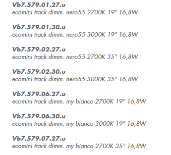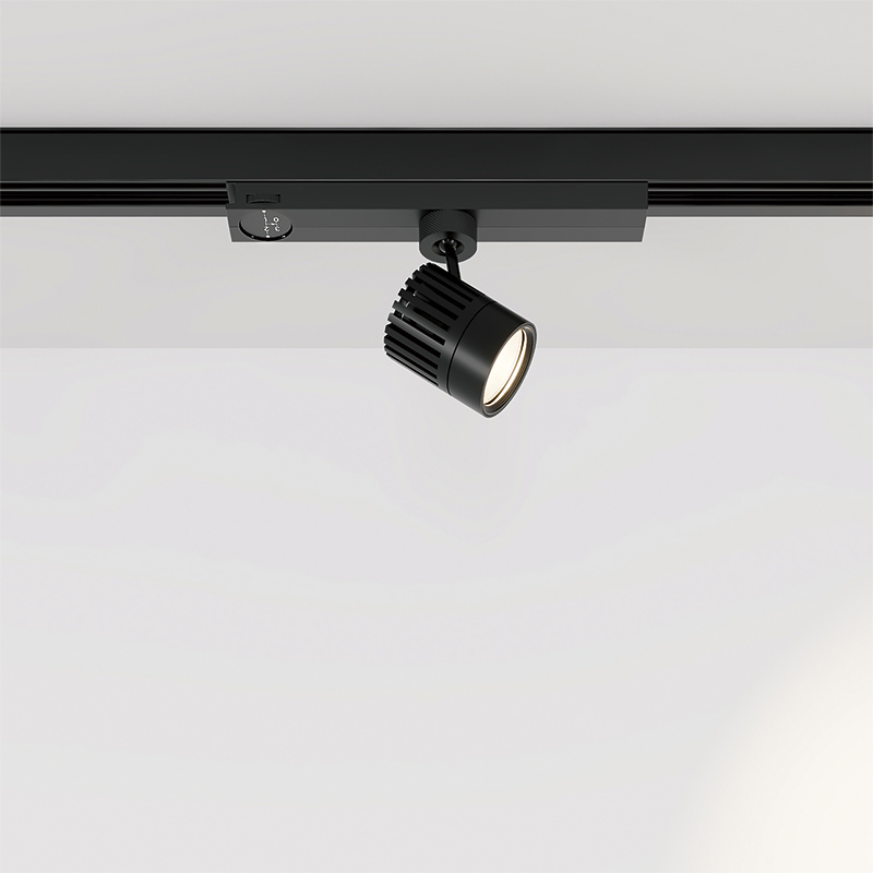 dry location rated track-mounted light fitting for indoor use. made of powder coated oxidized aluminium, consisting of diameter ?55mm/2.2’’ h.69mm/2.7’’ spotlight fixed to an adapter through a turning joint, adjustable by 360° on the vertical axis and by 90° on the horizontal axis. wired with les6 11,6W or les14 16.8W 2700K or 3000K up to 1791lm led source. optics: 13° 19° 35° 36° 120V 50-60Hz power supply included, also available in dimmable version with potentiometer. finishes: my bianco, nero55.