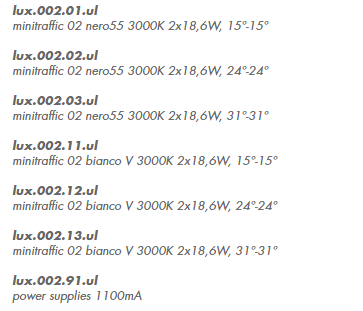 IP20 rated recessed light fitting for indoor use. body and front frame made of powder painted steel and heat sinkers made of oxidised aluminium. versions: minitraffic 02 280mm/11”x120mm/4.7” with two spotlights, wired with 3000K 18,6W 1950lm. optics 15° 24° 31° components: galvanized housing. finishes: bianco V or nero55.