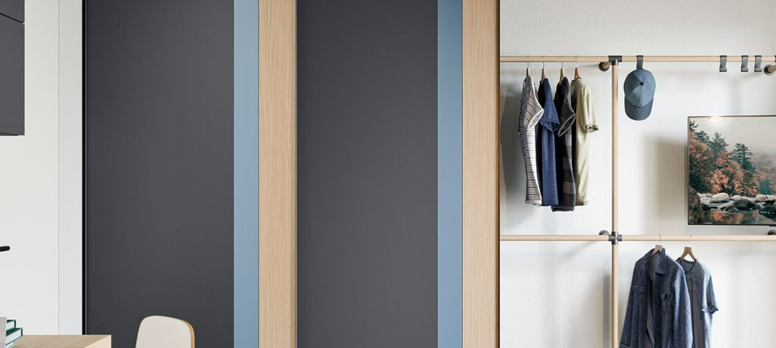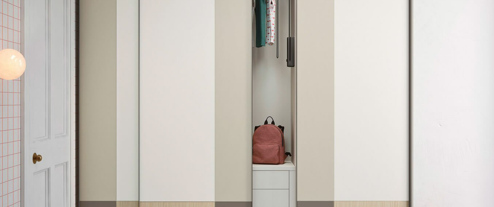 Gli armadi anta battente Nidi si adattano allo spazio a disposizione e si possono personalizzare all’interno con cassettiere, ripiani e tubi appendiabiti e all'esterno con le tante maniglie disponibili così, anche i più piccoli, possono aprirli e chiuderli con facilità.