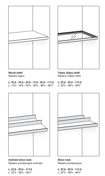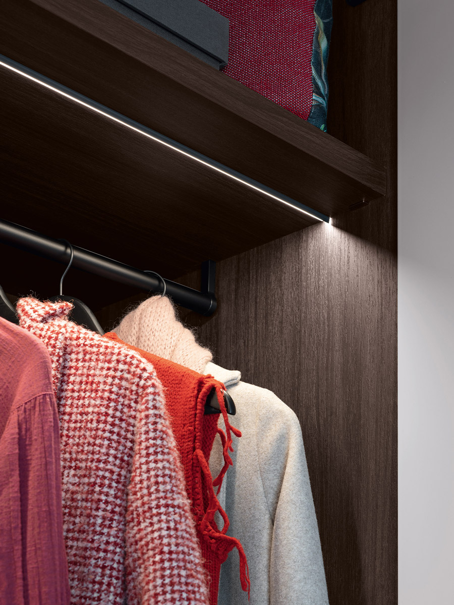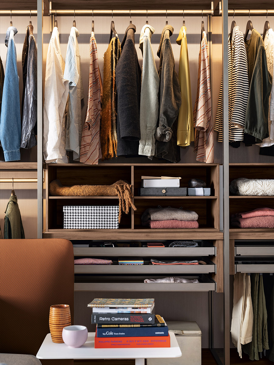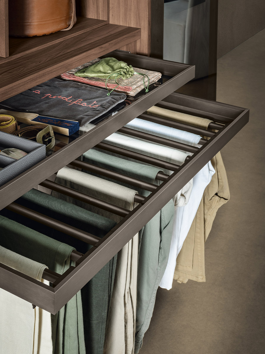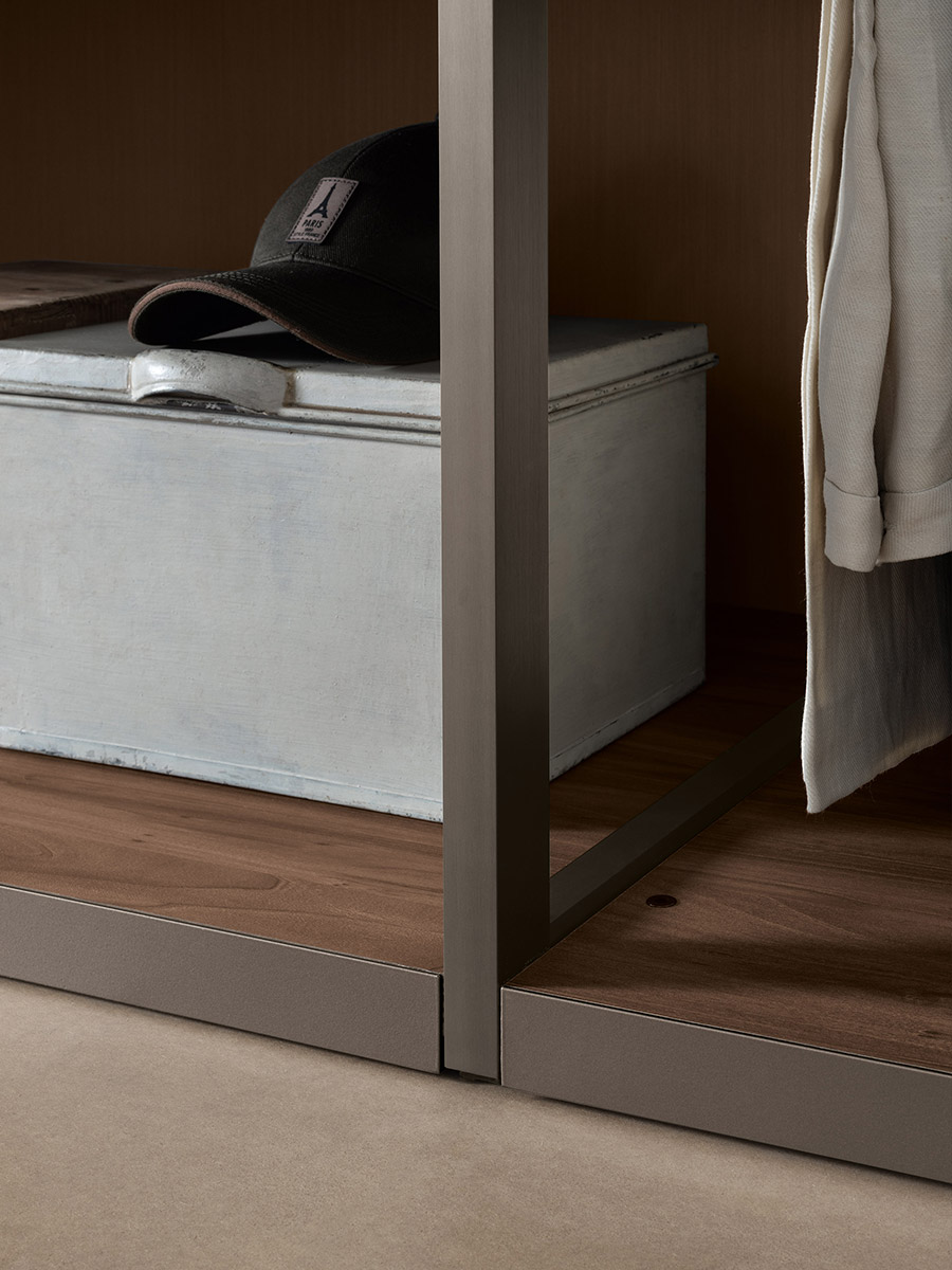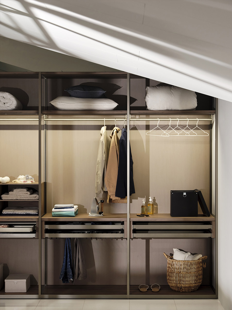 Aria is a wardrobe and walk-in wardrobe system that allows a combination of different units. The structure, with closed or through sides in Black or Bronze aluminium, can be closed by sliding or hinged doors in a choice of materials, also in aluminium with flush glass. Wardrobes and walk-in wardrobes can be fitted with suspended or floor-standing drawer units, storage racks, glass and aluminium pull-out shelves, boxes and customised accessory holders.