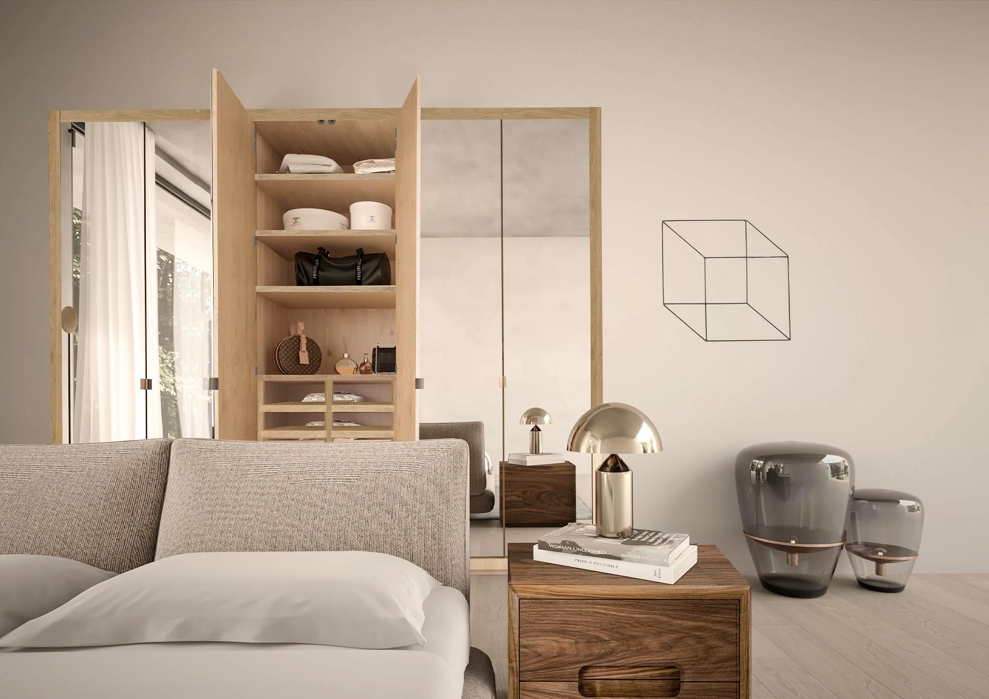 Armadio in legno massello e listellare, caratterizzato da ante battenti a specchio e telaio in legno massello, con interni in legno di cedro profumato, naturale rimedio contro le tarme. Personalizzabile con l’inserimento di appendiabiti, ripiani, cassettiere in legno massello con tradizionale incastro a coda di rondine e accessori vari, propone un’organizzazione funzionale e componibile dei vari elementi sulla base delle esigenze contenitive e delle dimensioni richieste.