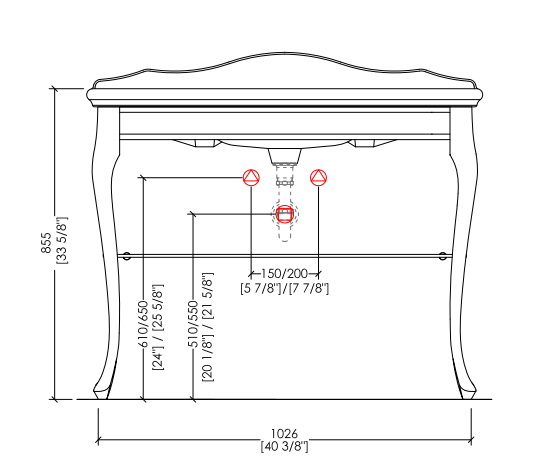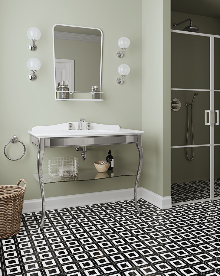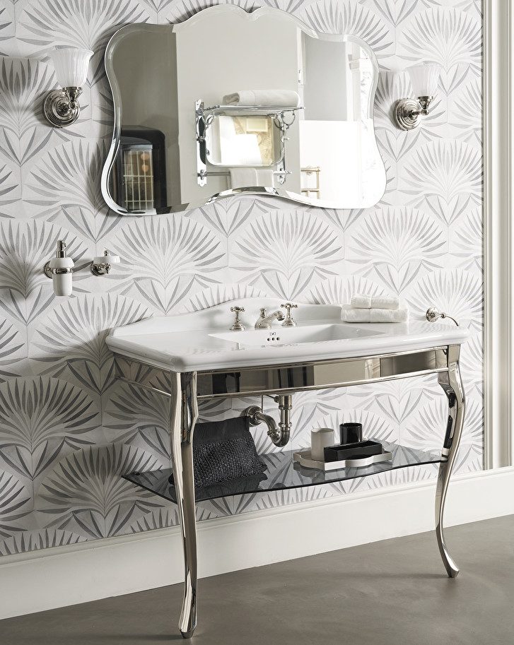 A classic-inspired console which reinterprets in a contemporary spirit an inspiration coming directly from the noble eighteenth-century houses. The top and basin are in ceramic, the shelf consists of transparent or smoke-grey glass. Its thin and sinuous legs are in fused-aluminium with chrome, light gold or polished nickel finishes.