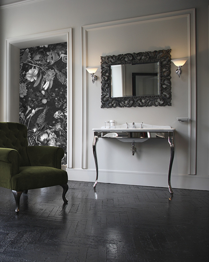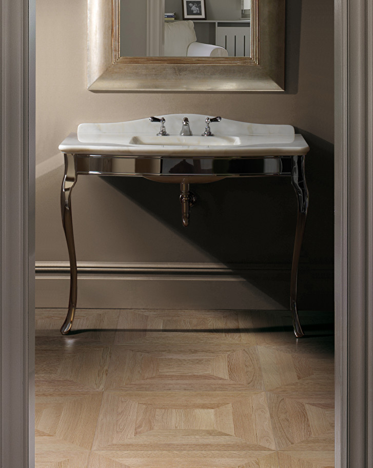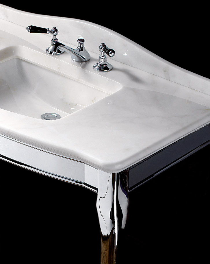 A classic-inspired console reinterpreted in a contemporary spirit and with high-quality materials. The cast-aluminium structure supports a brass band and the countertop washbasin in white Afyon, white Carrara, black Marquinha marble or absolute black granite. Its very sinuous legs, are available in chrome, light gold or polished nickel.
