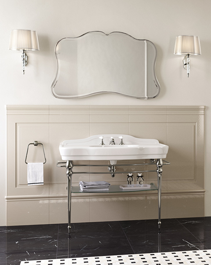 The Melody console, characterized by a light and harmonious design inspired by the Thirties, is equipped with a large ceramic top and with a glass shelf. The aluminium bearing structure with turned brass elements is available in chrome, light gold, polished nickel or copper finishes.