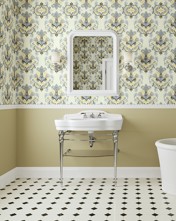 Designed to adapt Thirties-style allure to the smaller size of the modern bathroom, this compact version of the iconic Melody console has a ceramic top and a vanity shelf in extra-clear glass. The bearing structure in aluminium and turned brass is available in chrome, light gold, polished nickel or copper finishes.