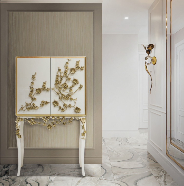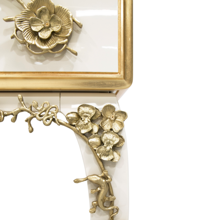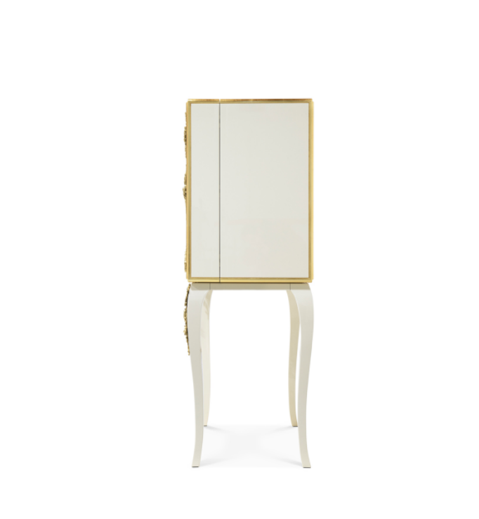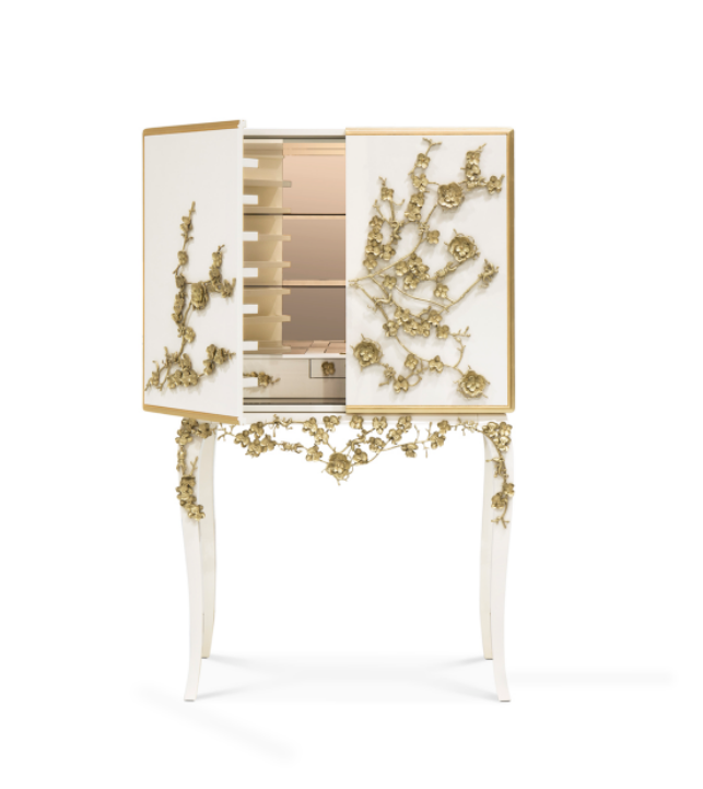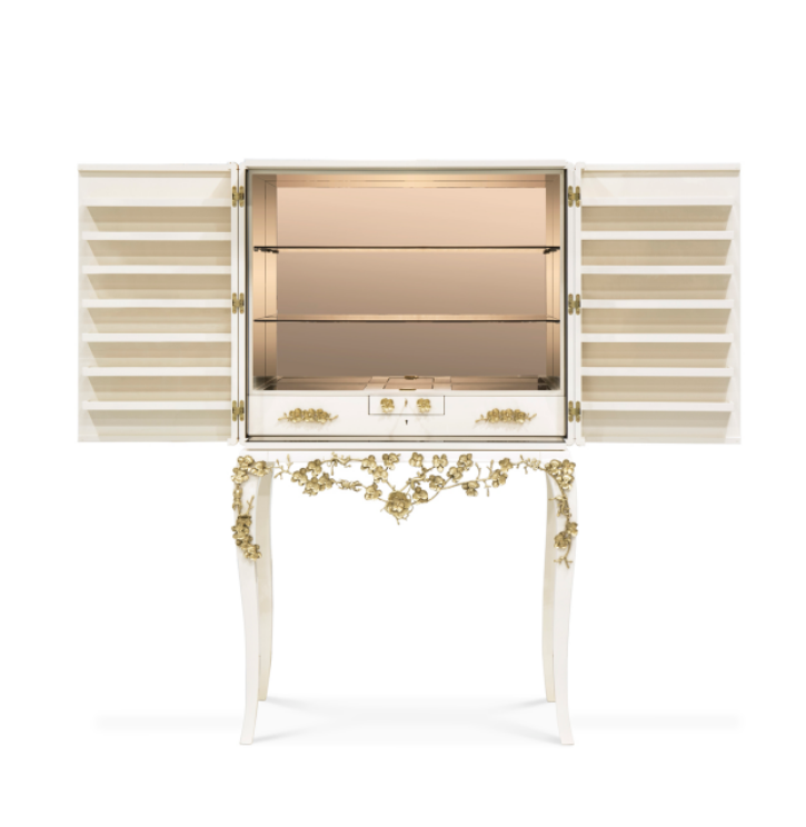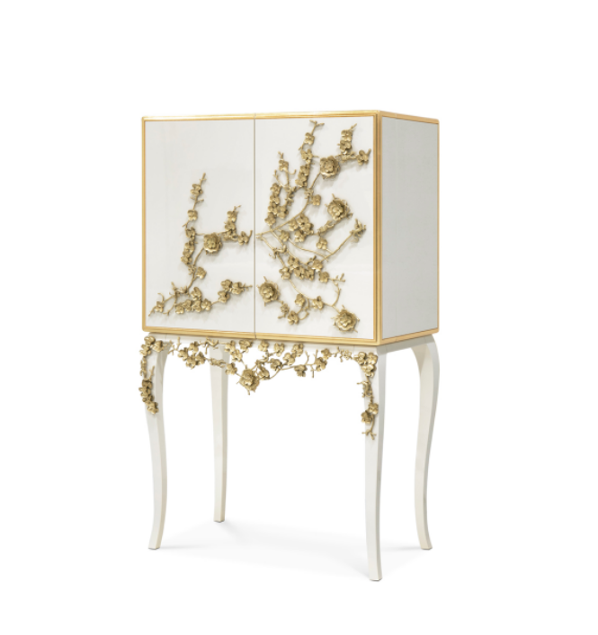 There is a sense of reveal and conceal as KOKET takes a beautiful bar cabinet in high gloss lacquer and adorns it in metal organic lace, revealing a mesmerizing hint of what lies beneath. The chic interior is perfectly designed to store your wine and cocktail accoutrements. The piece also features a long lockable drawer with a secret drawer for your most precious items hidden inside and an inset small drawer with a cedar wood interior for cigars. Open or closed with, this bar cabinet is ready for a glamourous soiree. Cheers!
