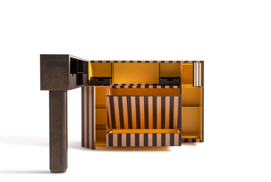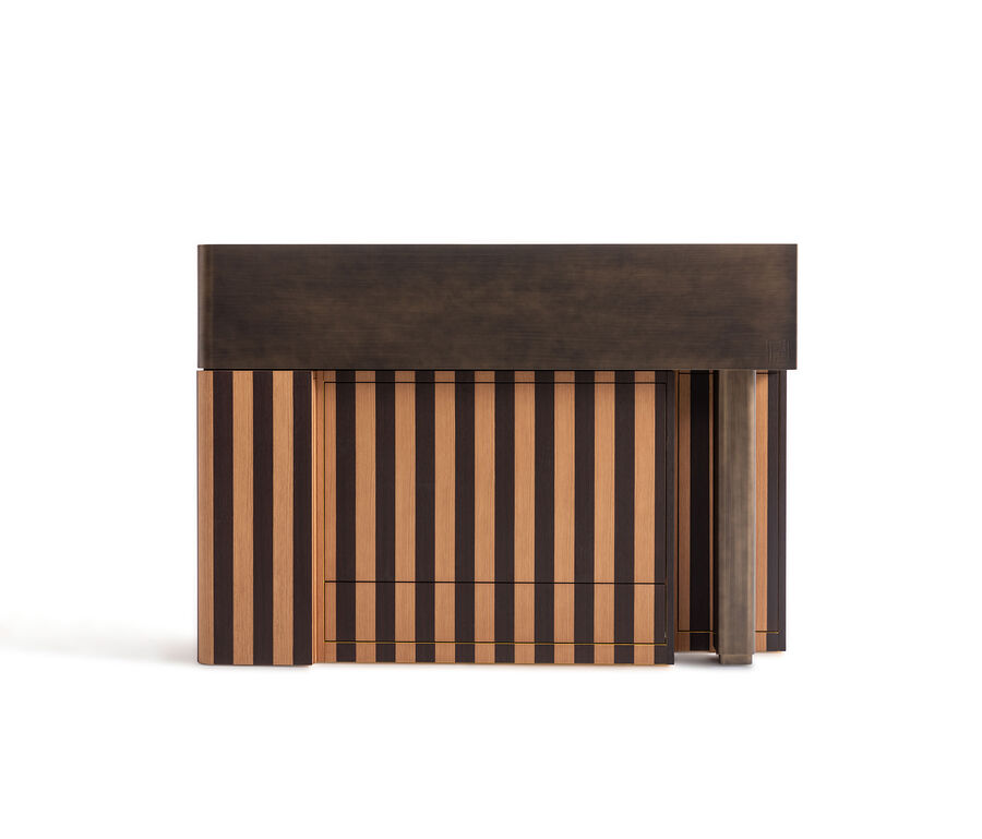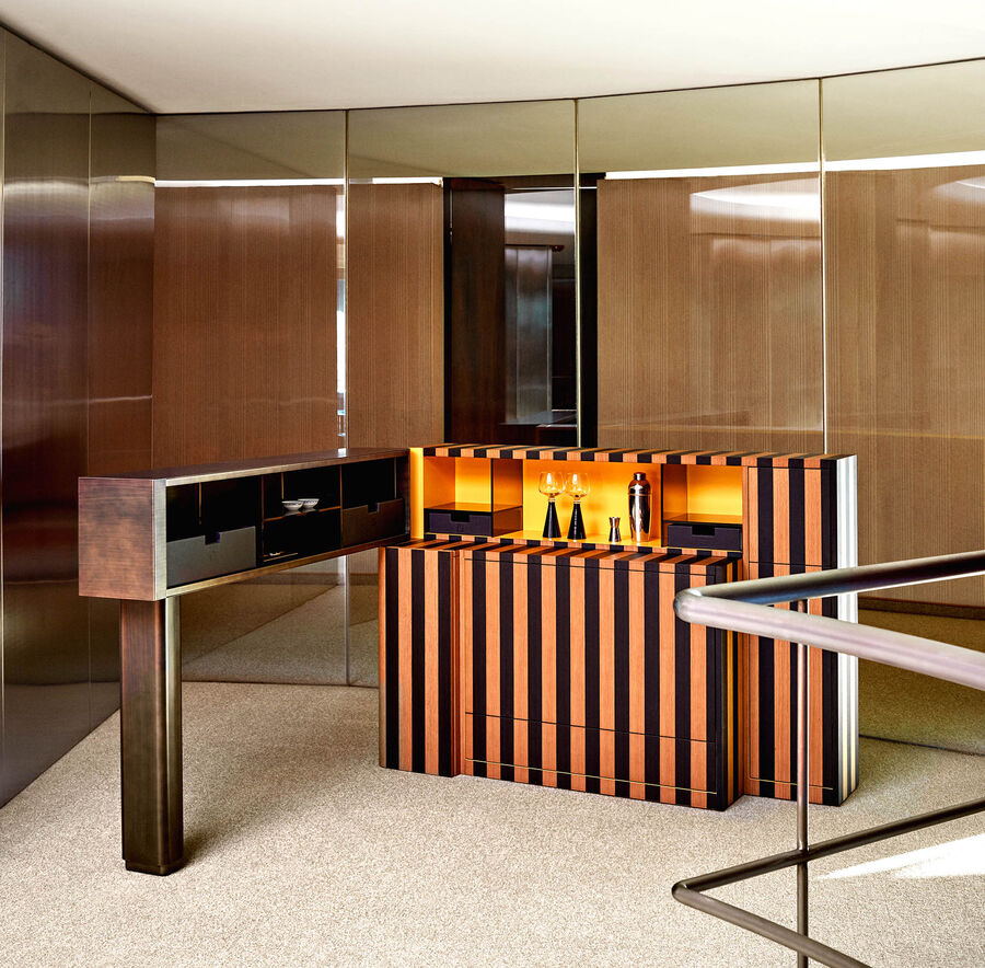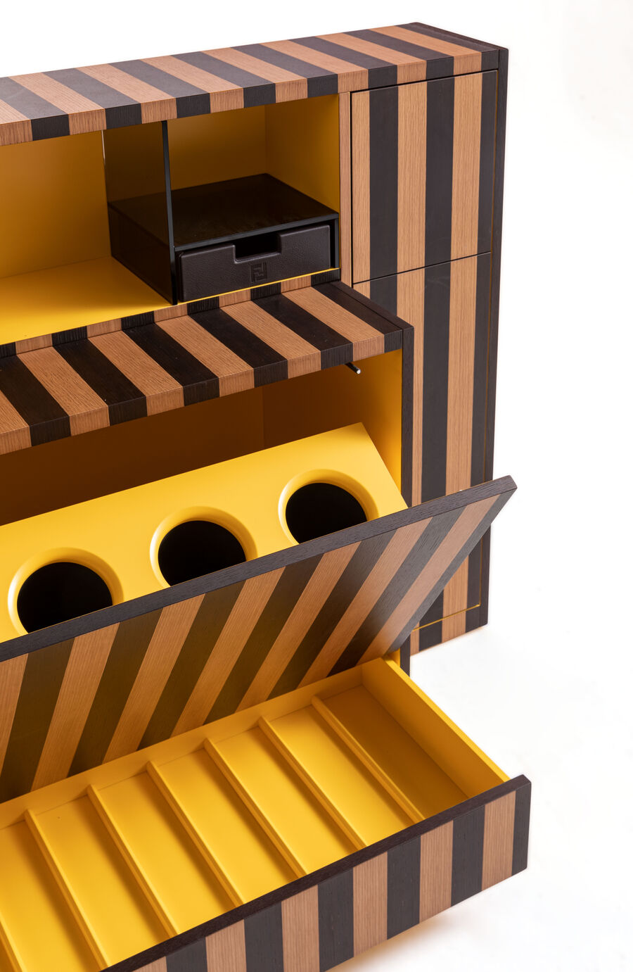 The Aperitivo mobile bar is made in lacquered wood with an elegant Pequin-effect inlay. Conceived as a unique item of furniture, it features a mobile arm, glass shelves and compartments for glasses and bottles. References to Fendi's iconic style reinterpret a classic decor object in a contemporary version that remains faithful to the functionality of its origins.