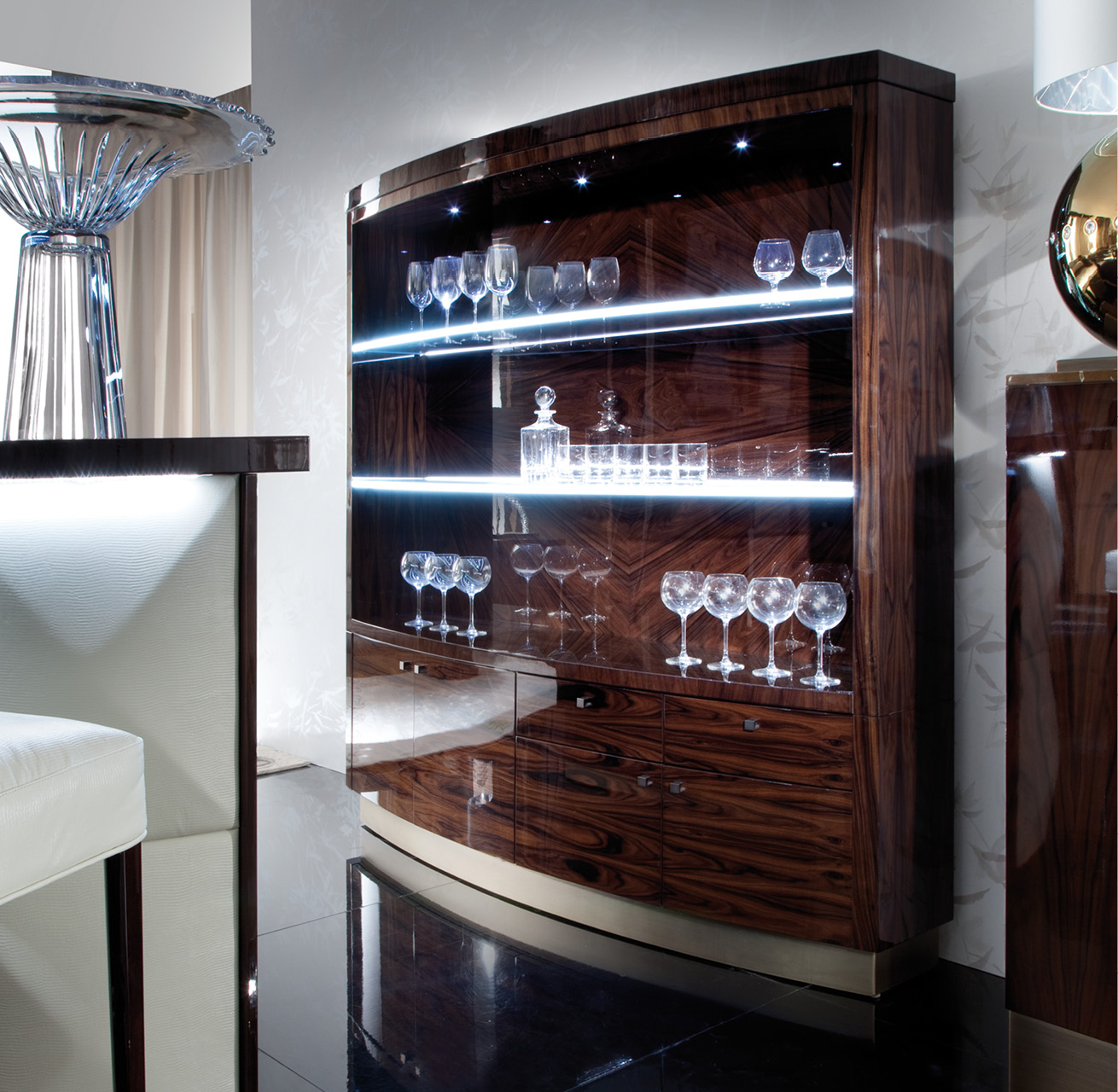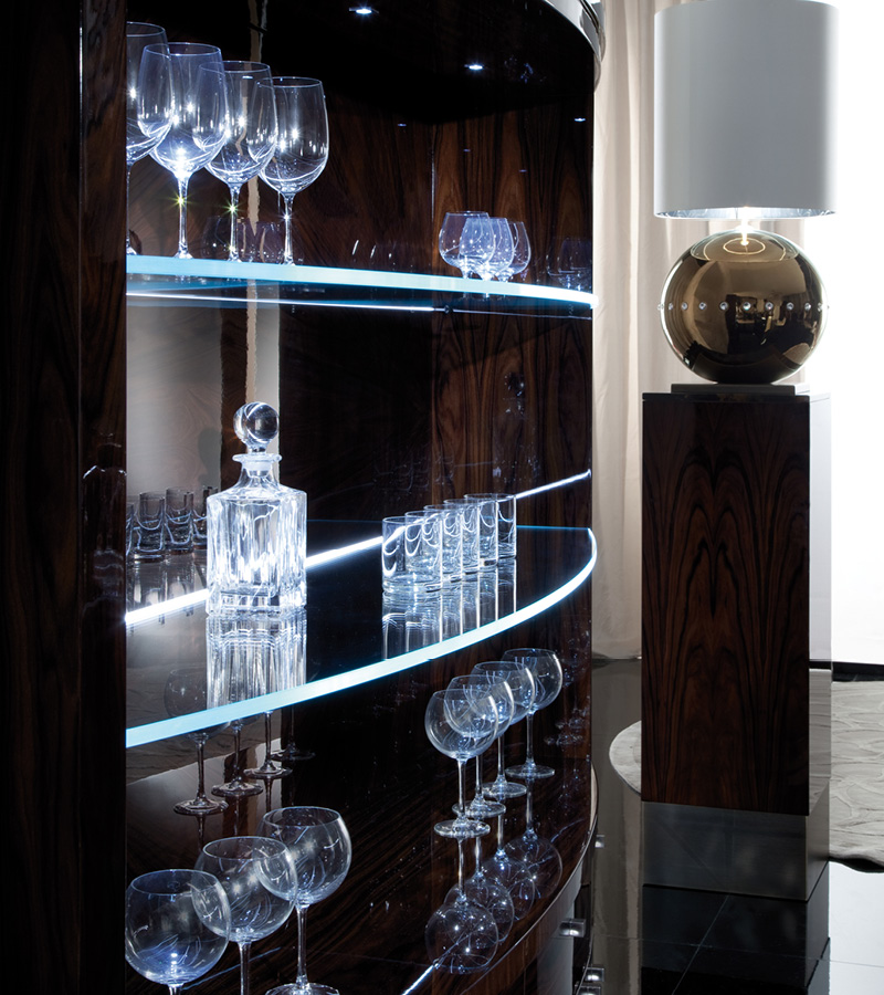 Bar cabinet in Brazilian rosewood veneer with high gloss polyester finish with front curved parts. 2 long tempered clear glass shelves with back led lights sistem. 2 full extension drawers with bottom velvet inside. 2 big doors with adjustable glass shelves and 2 small doors without shelves. Base and details bronzed stainless steel.