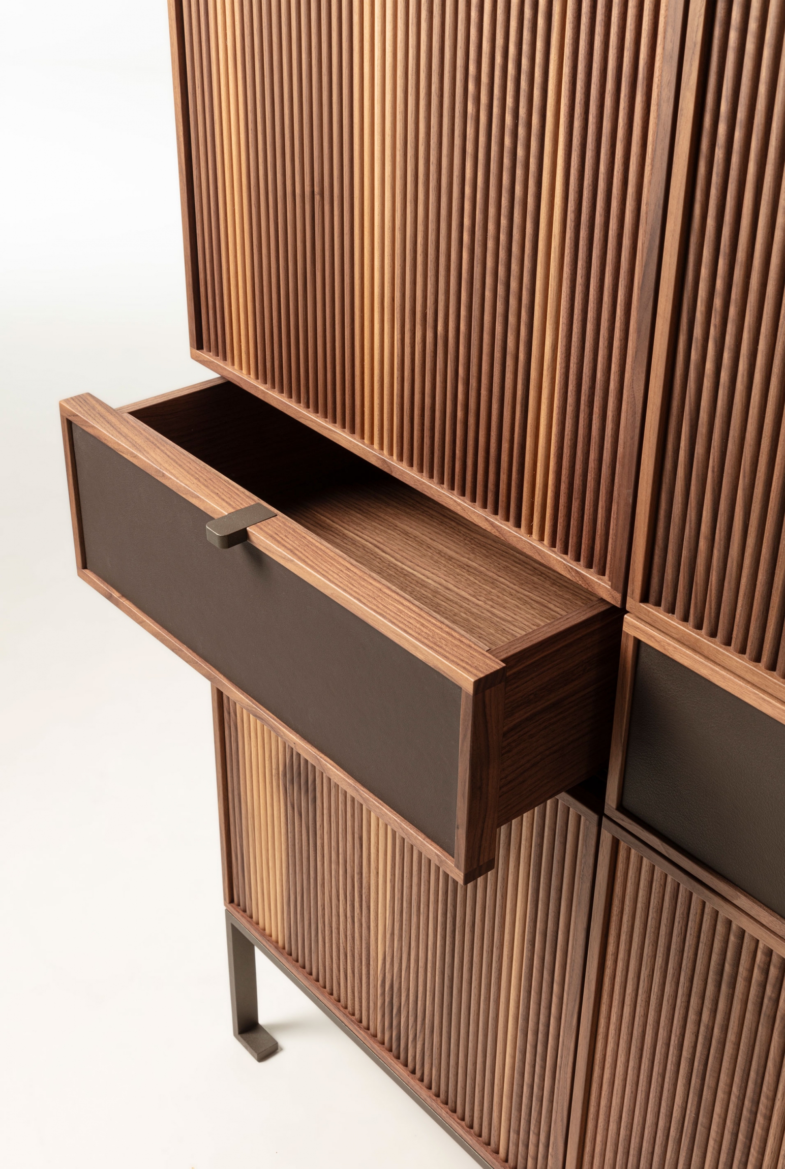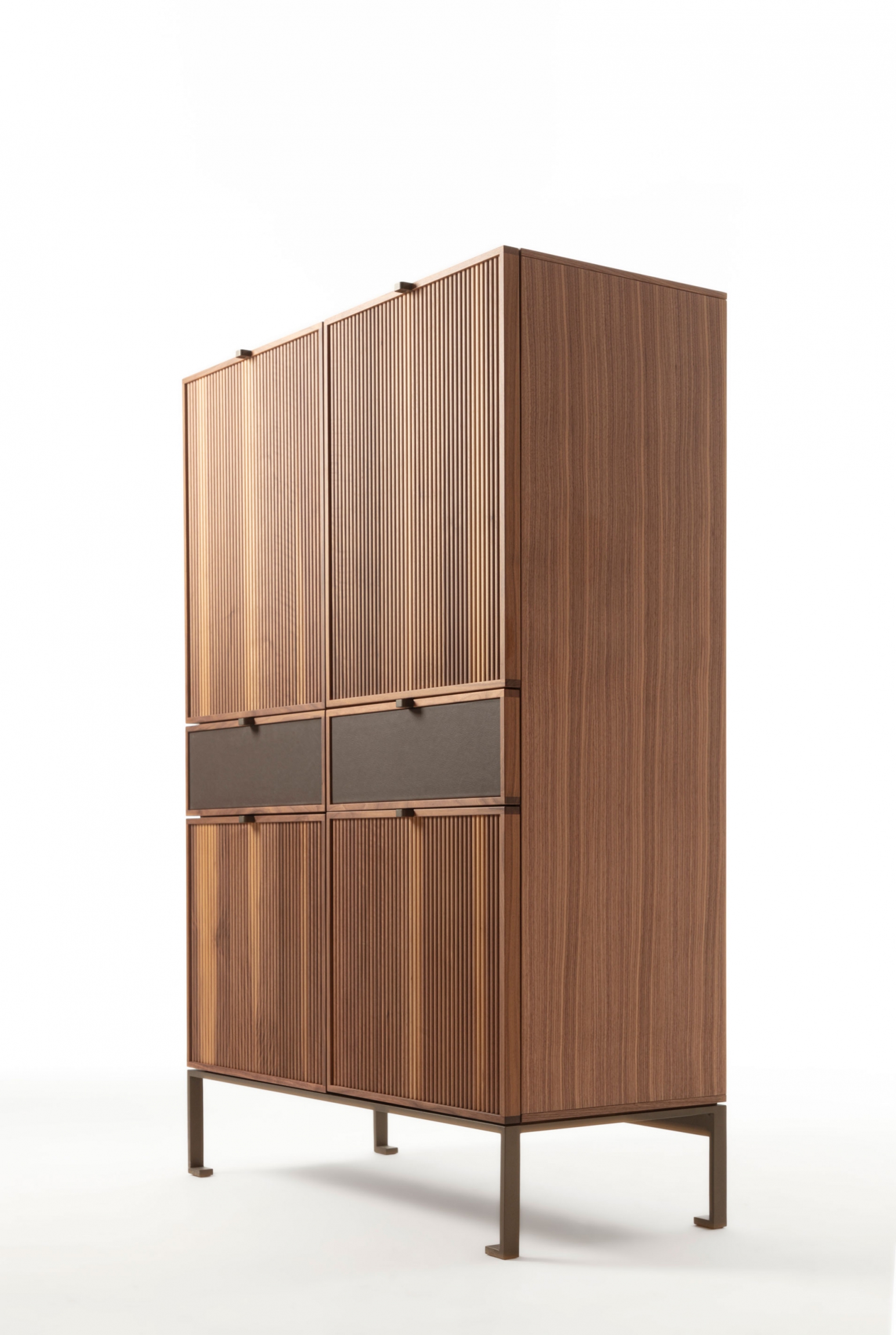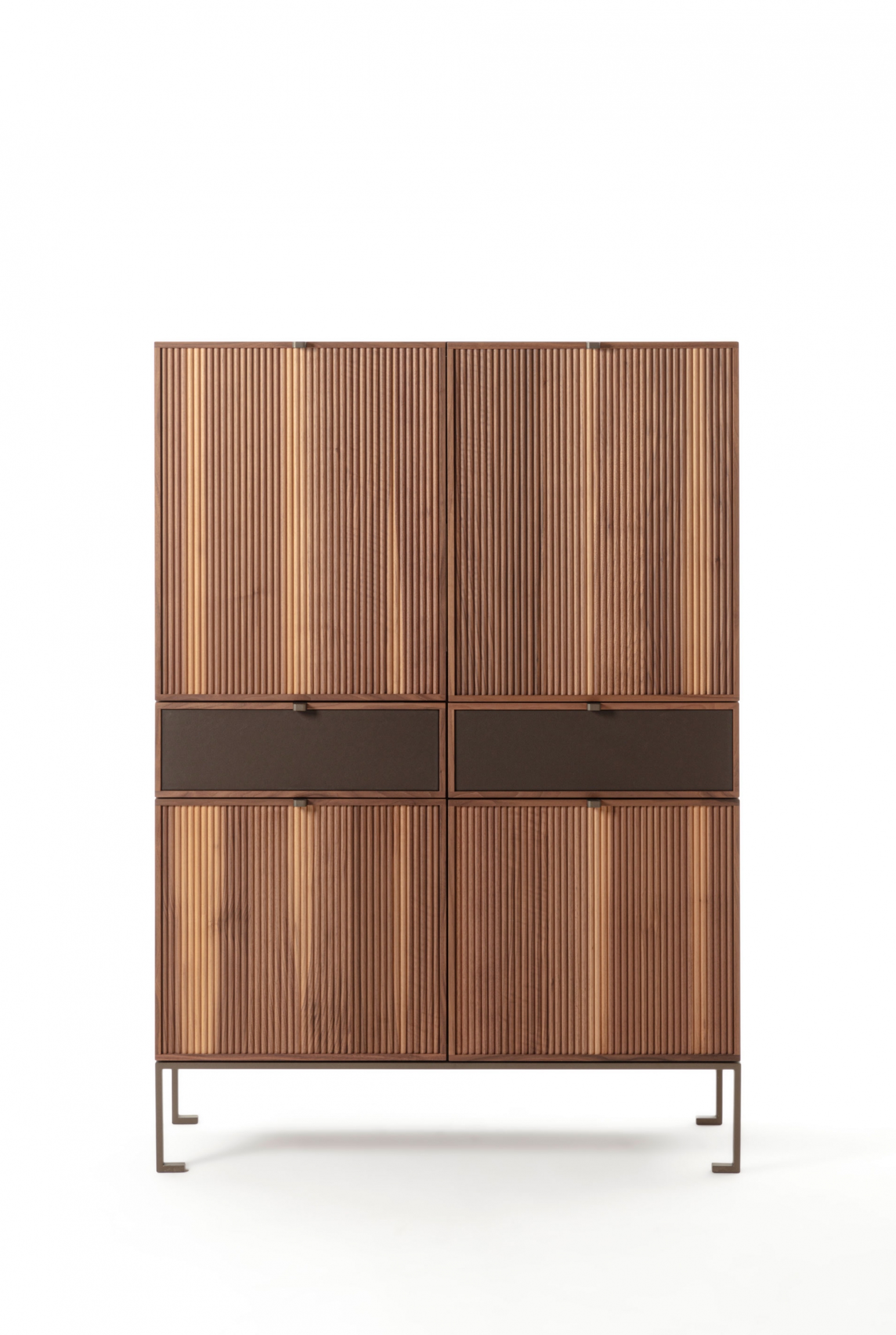 Wooden storage cabinet with metal base. The top is wood and frontally we see four wooden doors with a cannulated finish, interspersed with two drawers with leather-covered front.