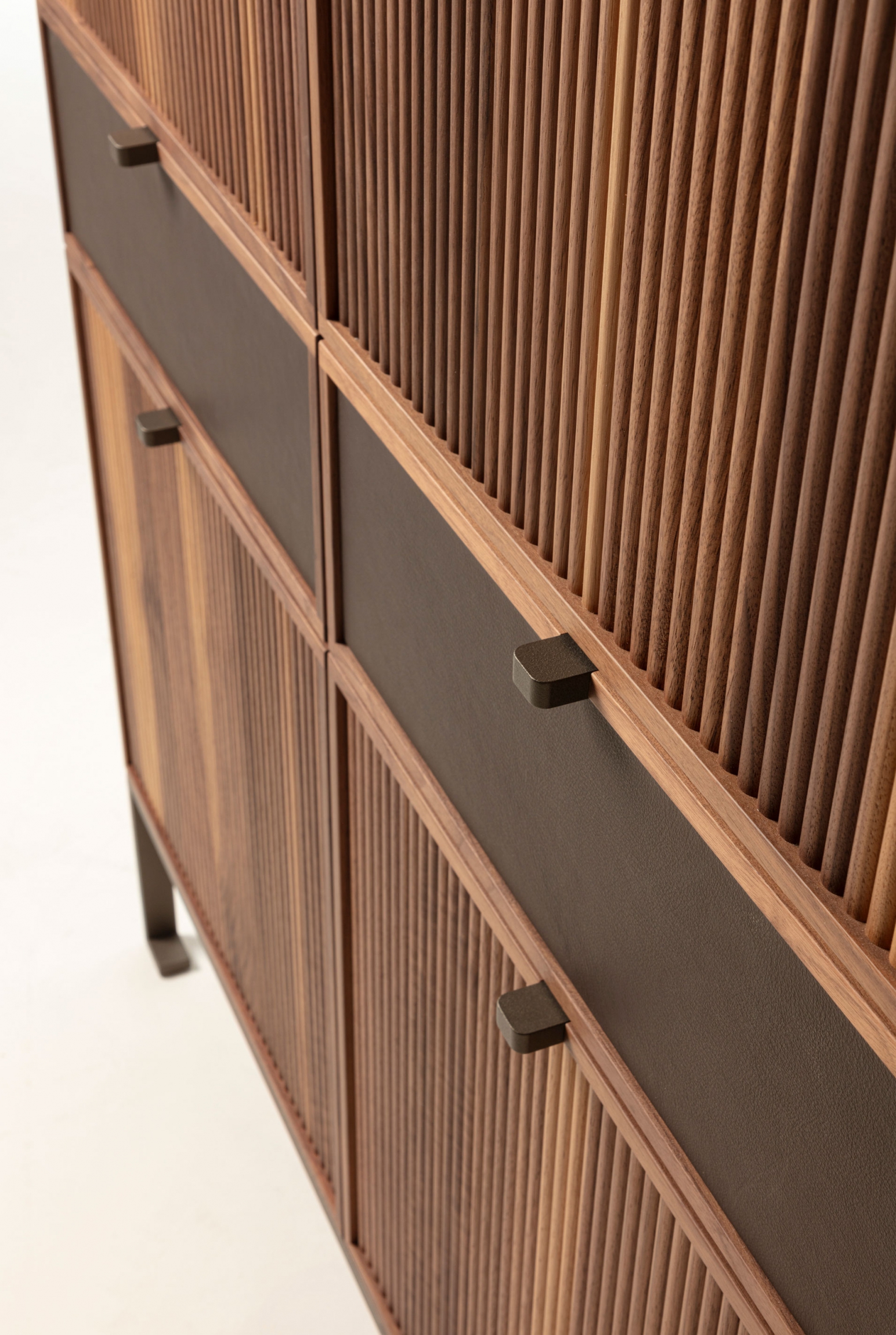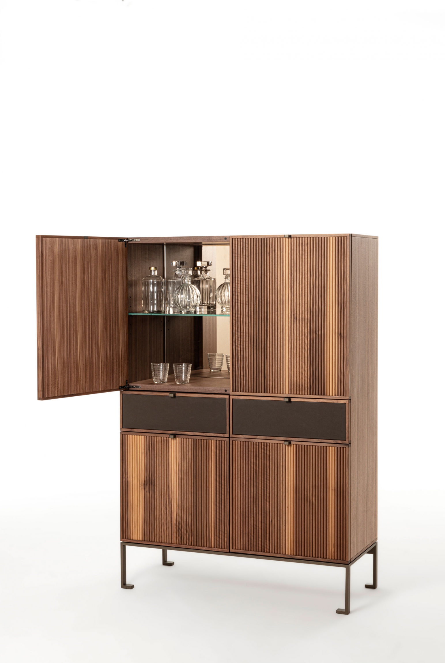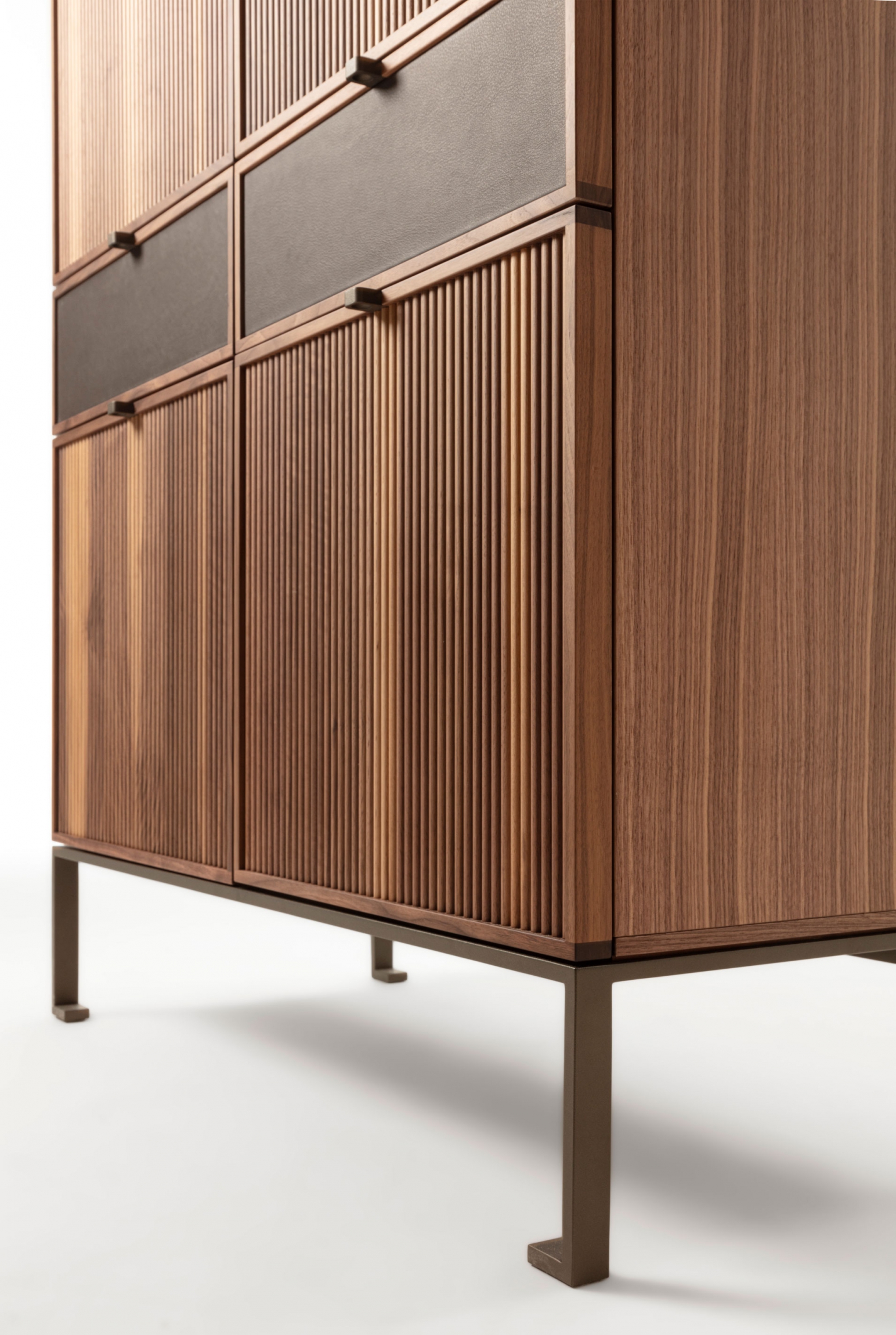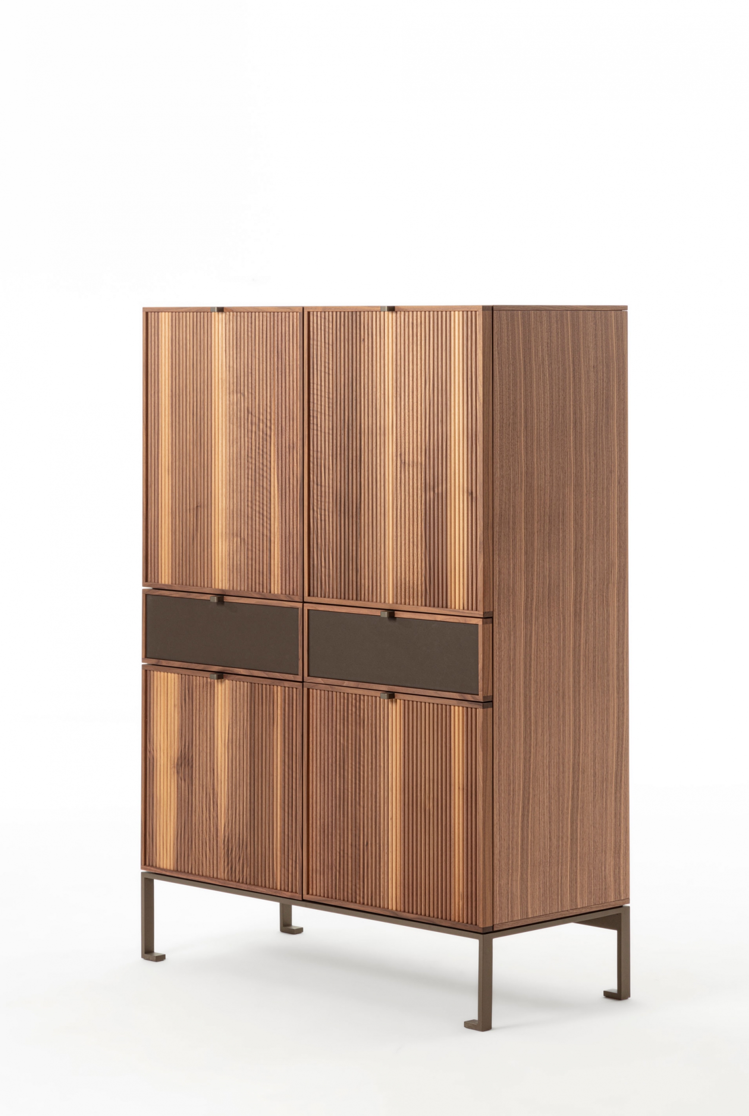Wooden storage cabinet with metal base. The top is wood and frontally we see four wooden doors with a cannulated finish, interspersed with two drawers with leather-covered front.