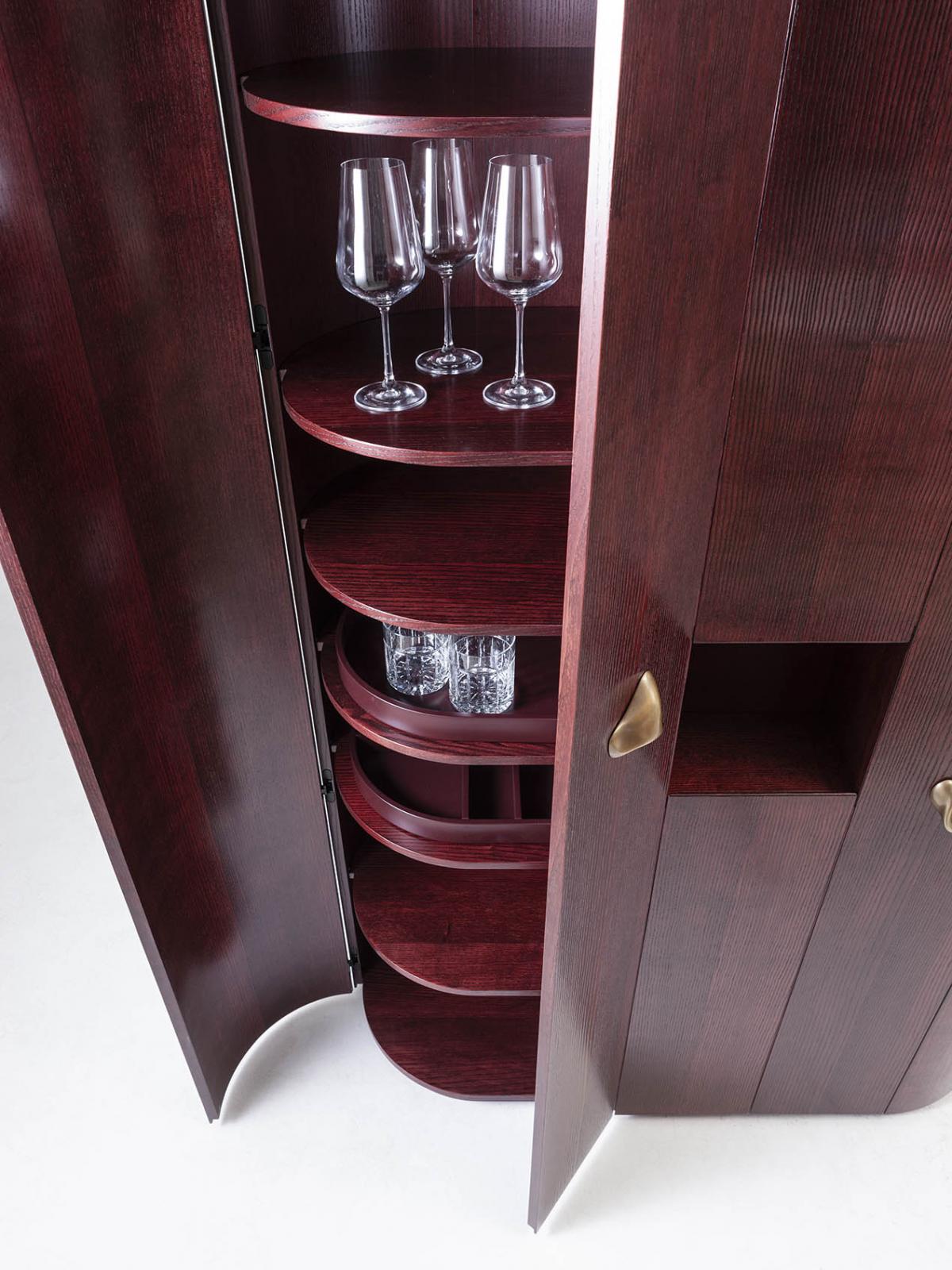 Tall storage unit in plain, dyed or lacquered wood with 4 hinged doors and a drawer, a small decorative niche and curved sides. Equipped with internal shelves and customized trays.