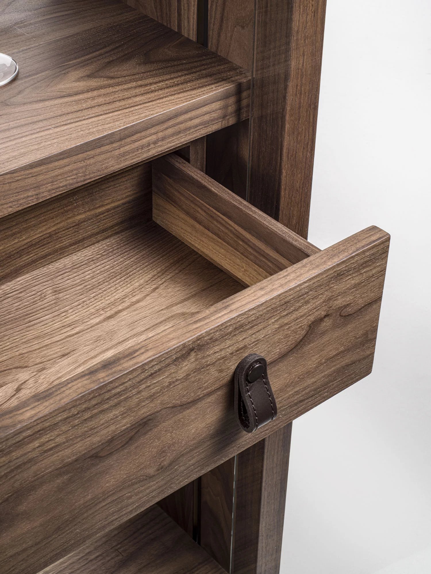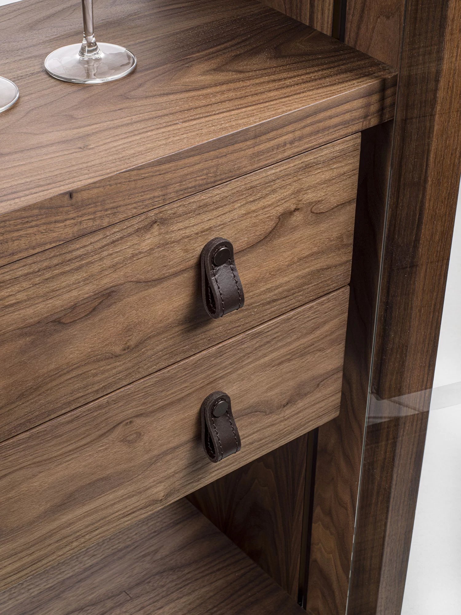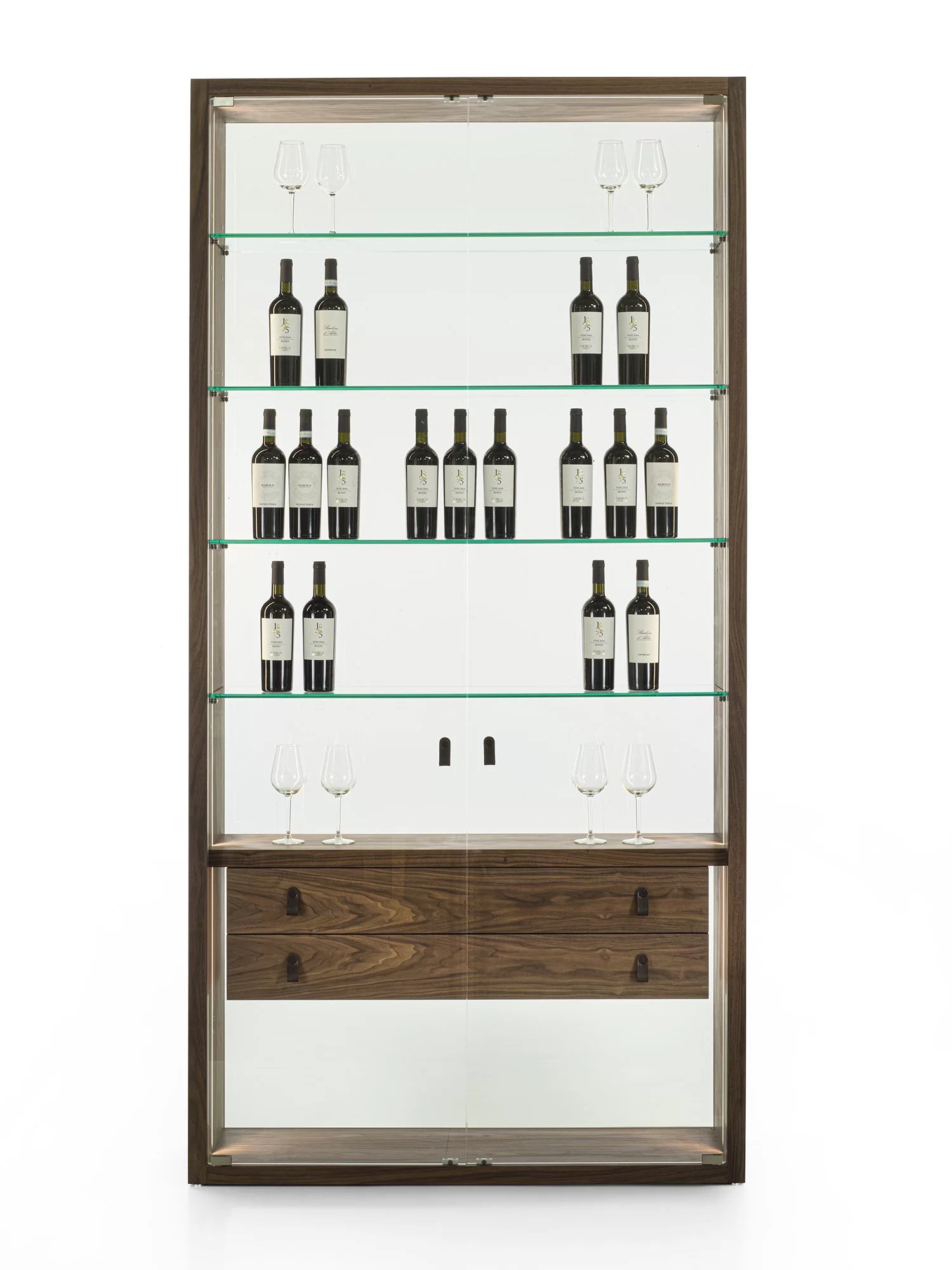 Vetrina alta, tipo espositore, con struttura in legno massello e listellare, caratterizzata da ante, quattro ripiani interni e schienale in vetro. Dotata di cassettiera interna con due cassetti. Maniglie in cuoio ne facilitano l’apertura. Illuminata da un sistema di luci LED verticali.