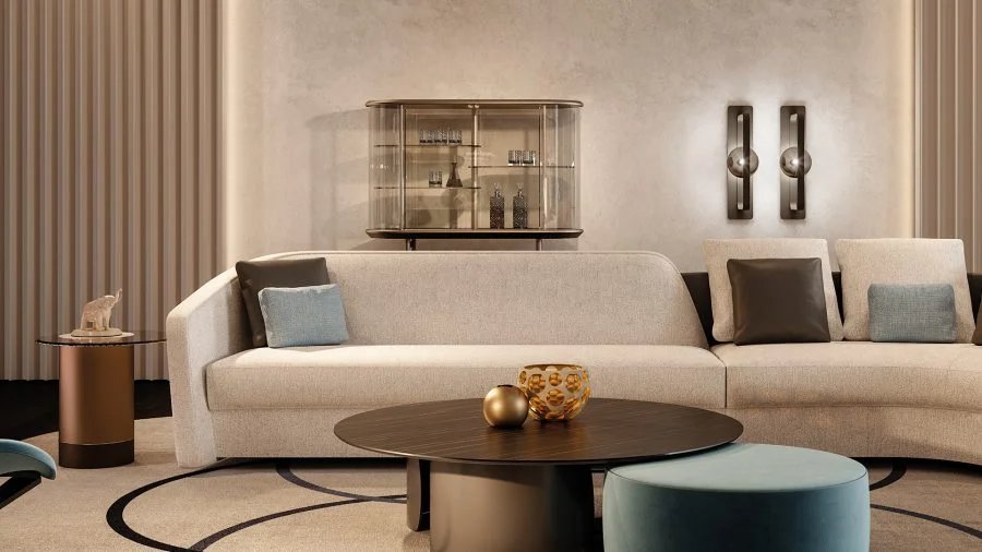 Bar con struttura e ripiani in vetro extrachiaro. Fondo,coperchio e basamento in finitura Bronze. Inserto top in MarmoReflex o LegnoReflex. Due ante con apertura sincronizzata tramite gli ingranaggi a vista in finitura oro e cromo lucido su fondale in vetro Mesh. Edizione numerata.