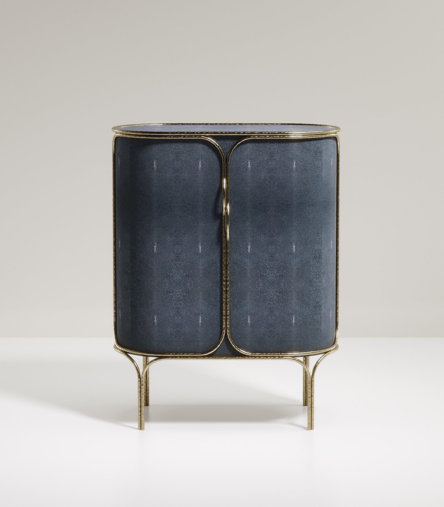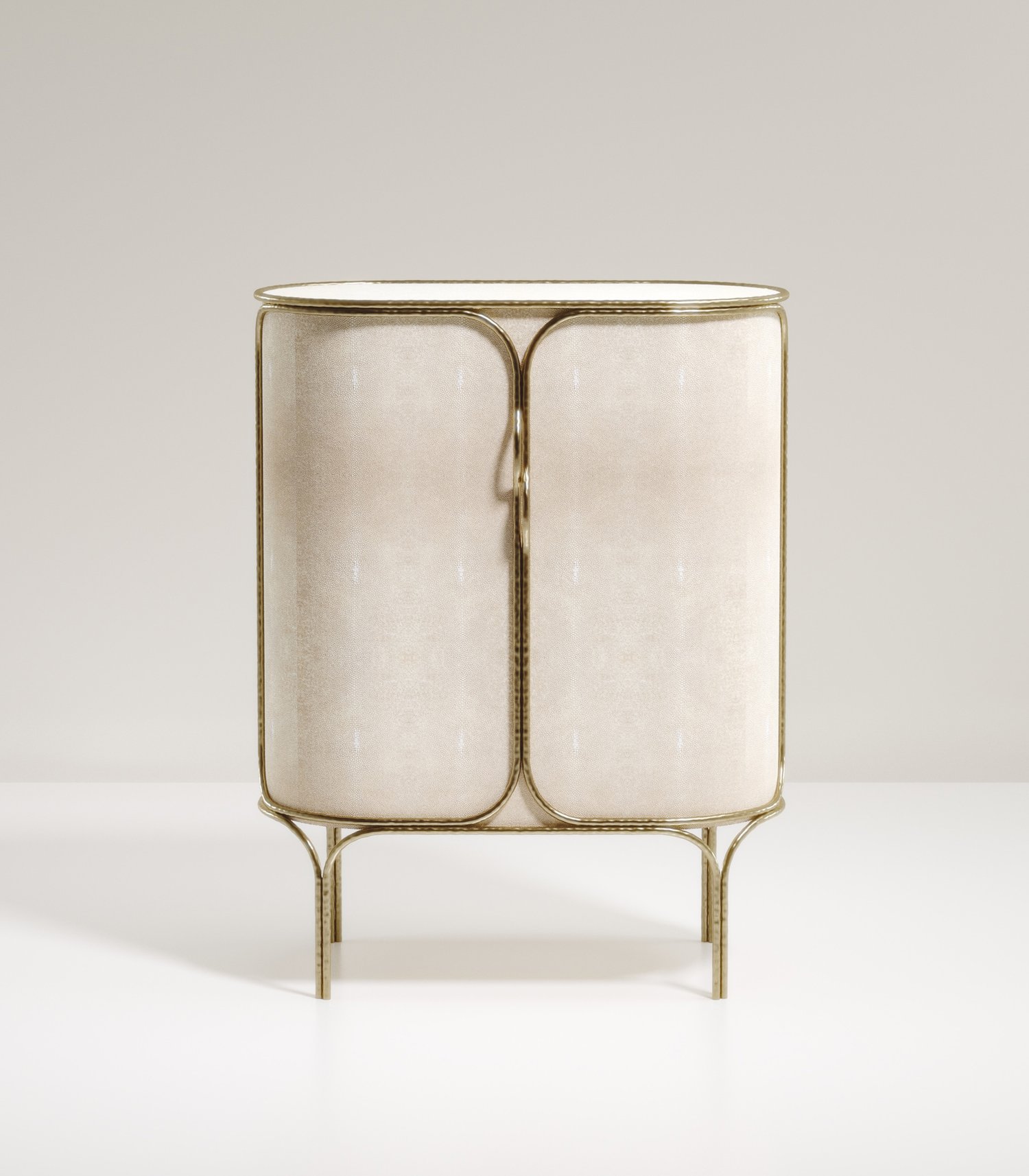 The Arianne bar cabinet by R&Y Augousti is one of a kind statement piece. The overall piece is inlaid in cream shagreen accentuated with intricate bronze-patina brass details that have the signature Augousti "melting" effect. The interior of the piece is in wood veneer and opens to 3 shelves. This piece is part of the Arianne Capsule.