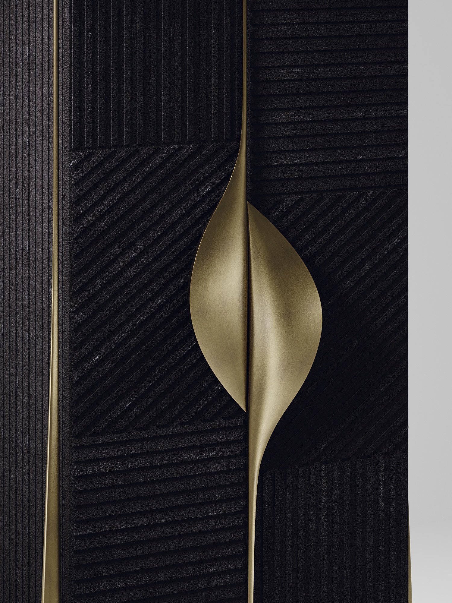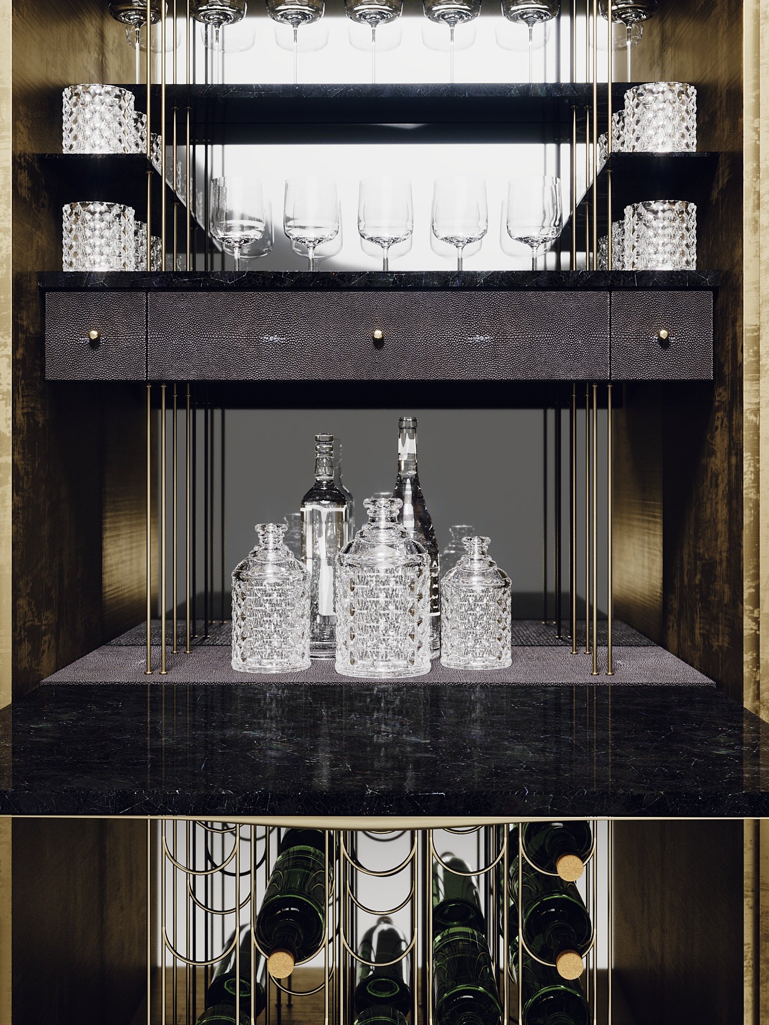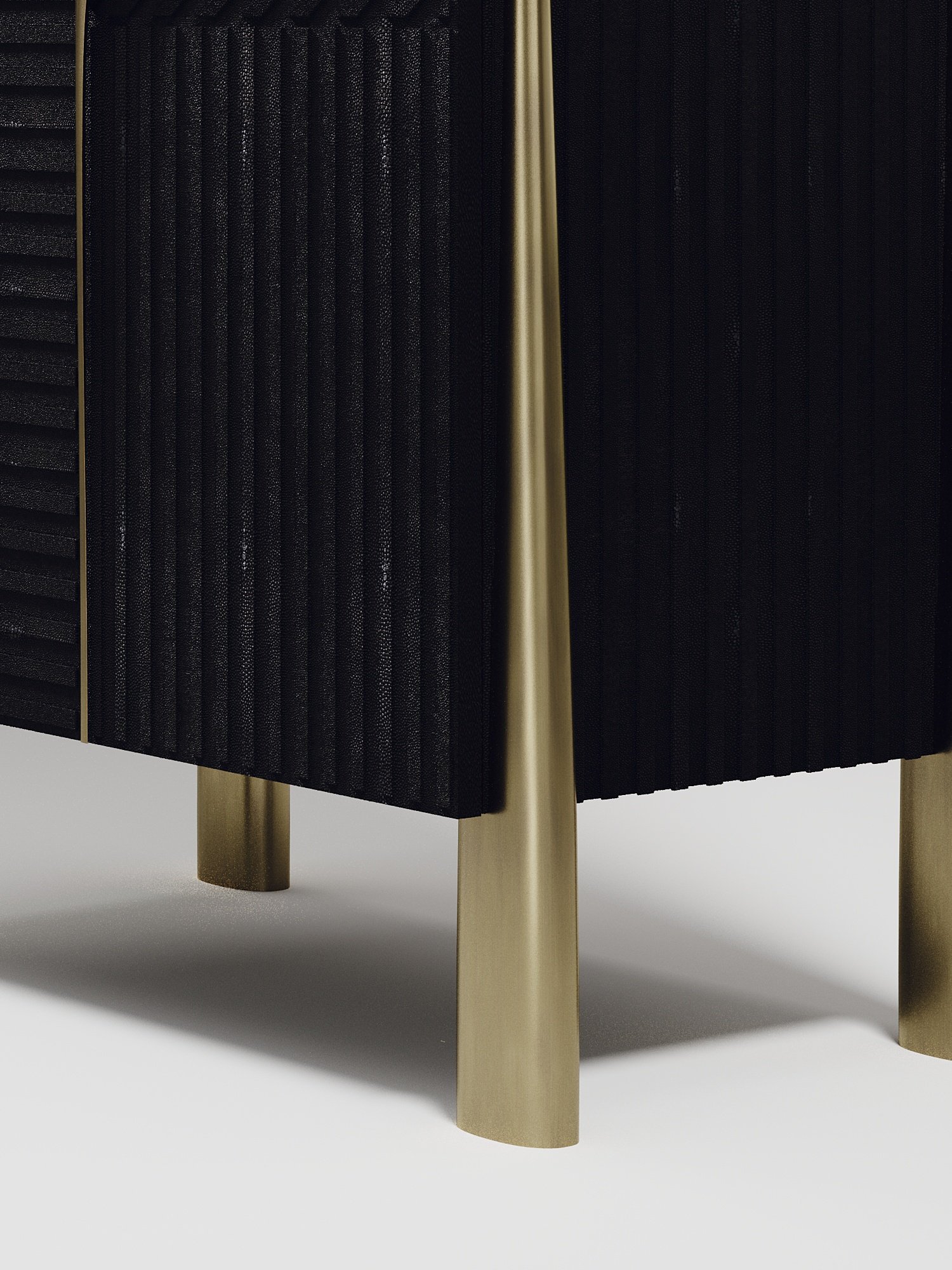 The Wave Bar Cabinet by R&Y Augousti is one of a kind statement piece. The overall piece is inlaid in coal black shagreen, with the exterior hand-carved in an updated version of the signature Augousti "rhomboid" pattern. The door handles and legs are in a bronze-patina brass. The interior of the piece opens up to an ultra luxe bar. The interior includes a back wall lined in a mirror, a flap top compartment in shell, bronze-patina brass shelving and shagreen drawers. The walls are in gilded-gold. Available in other finishes and as a vanity cabinet