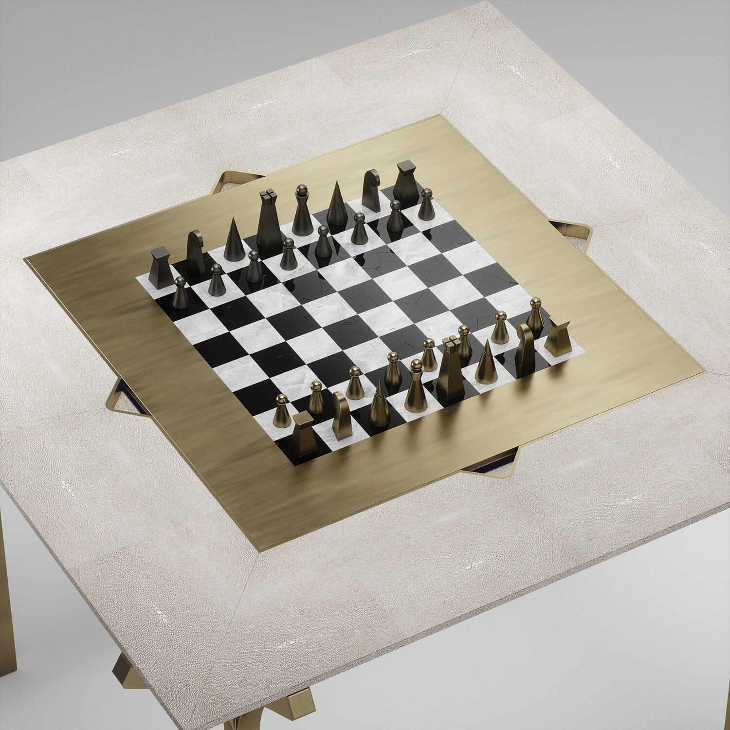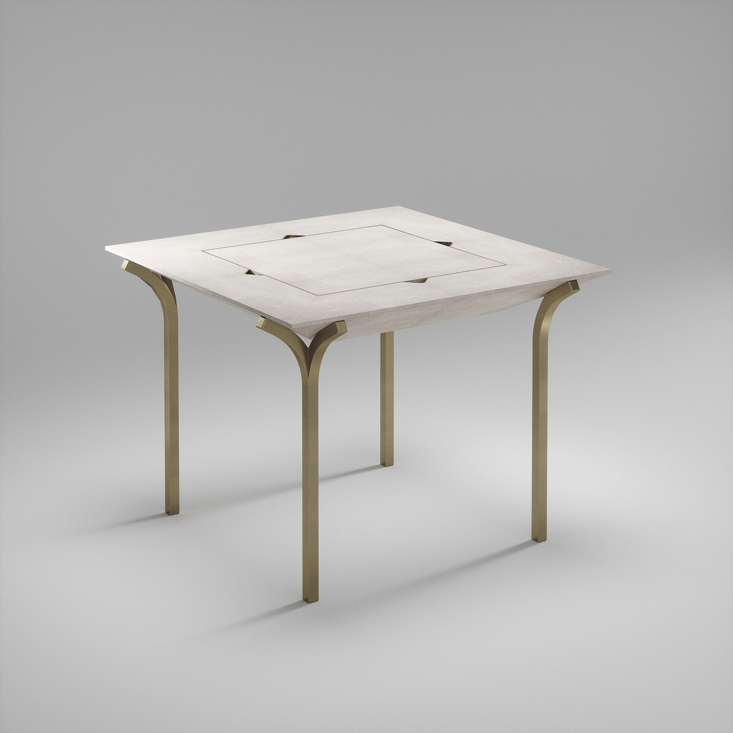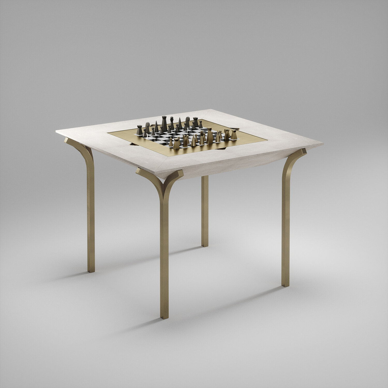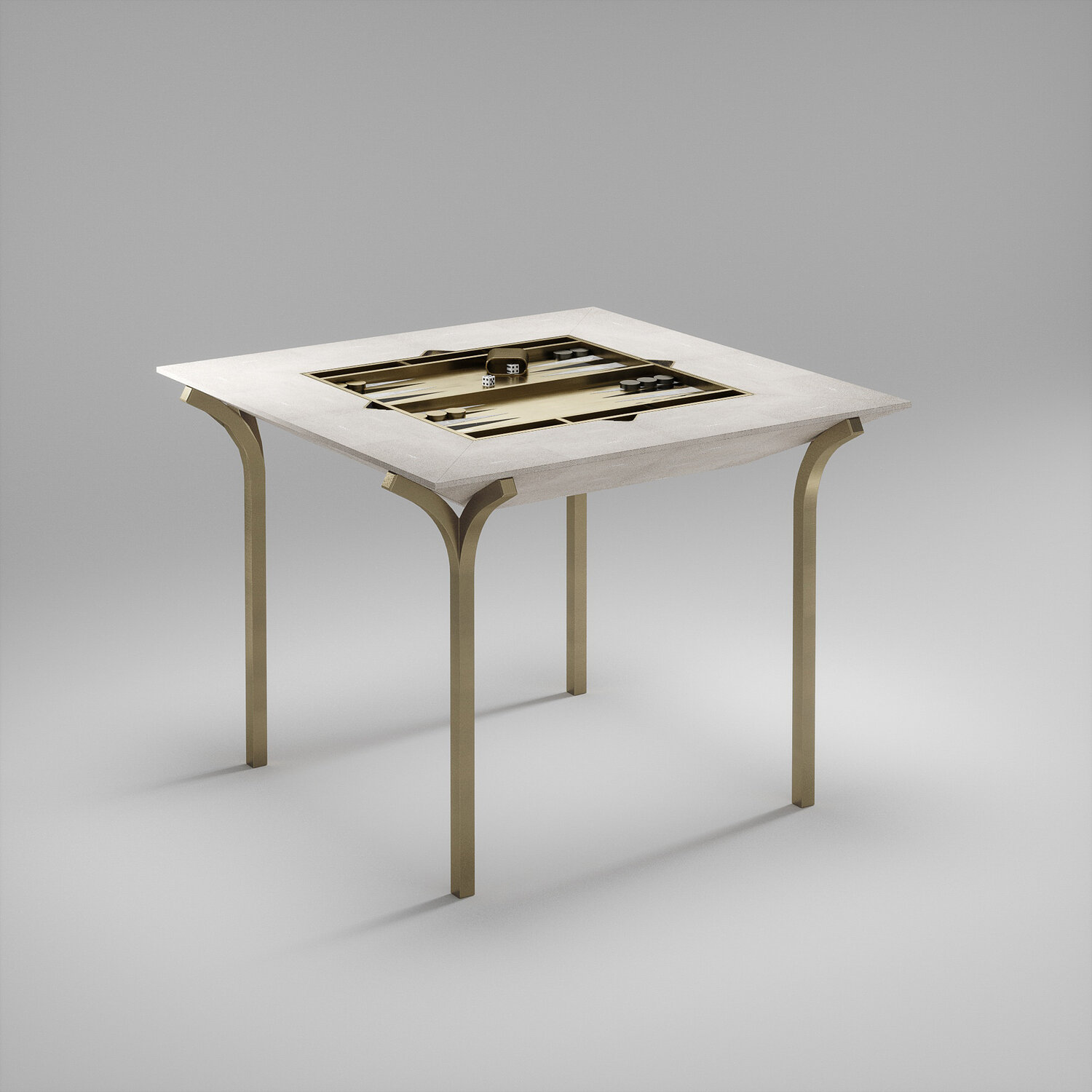 The 4 in 1 Marcel game table R&Y Augousti is a truly luxurious statement piece for your home. The clean lines of the overall piece in cream shagreen, accentuated by the sculptural and sleek bronze-patina brass legs make it versatile for any space. This piece includes a complete game package set with interchangeable boards that stack on top of each other in the centre of the table; one for chess, one for backgammon, a green velvet bard to play your favourite card games and a plain shagreen board if one were to use it as a beautiful centre piece.