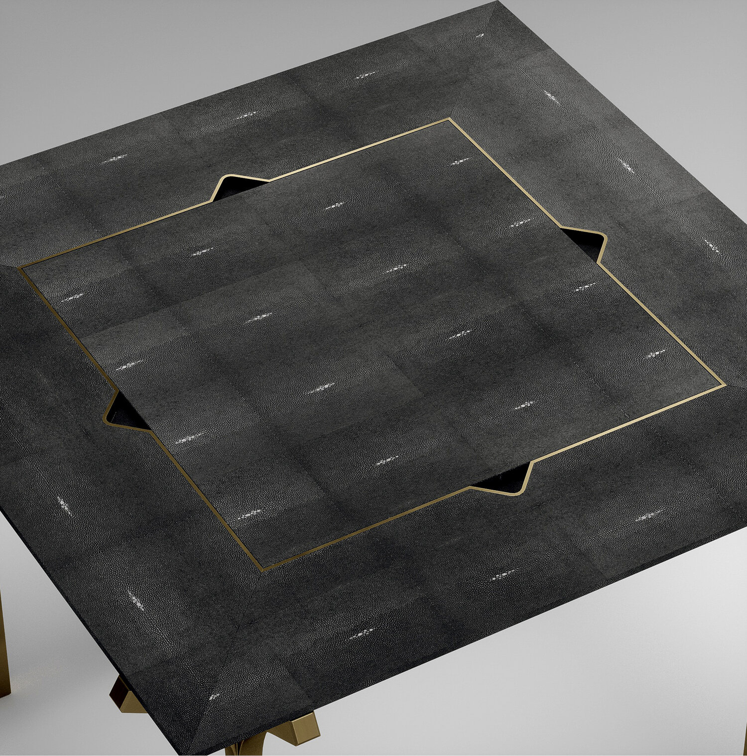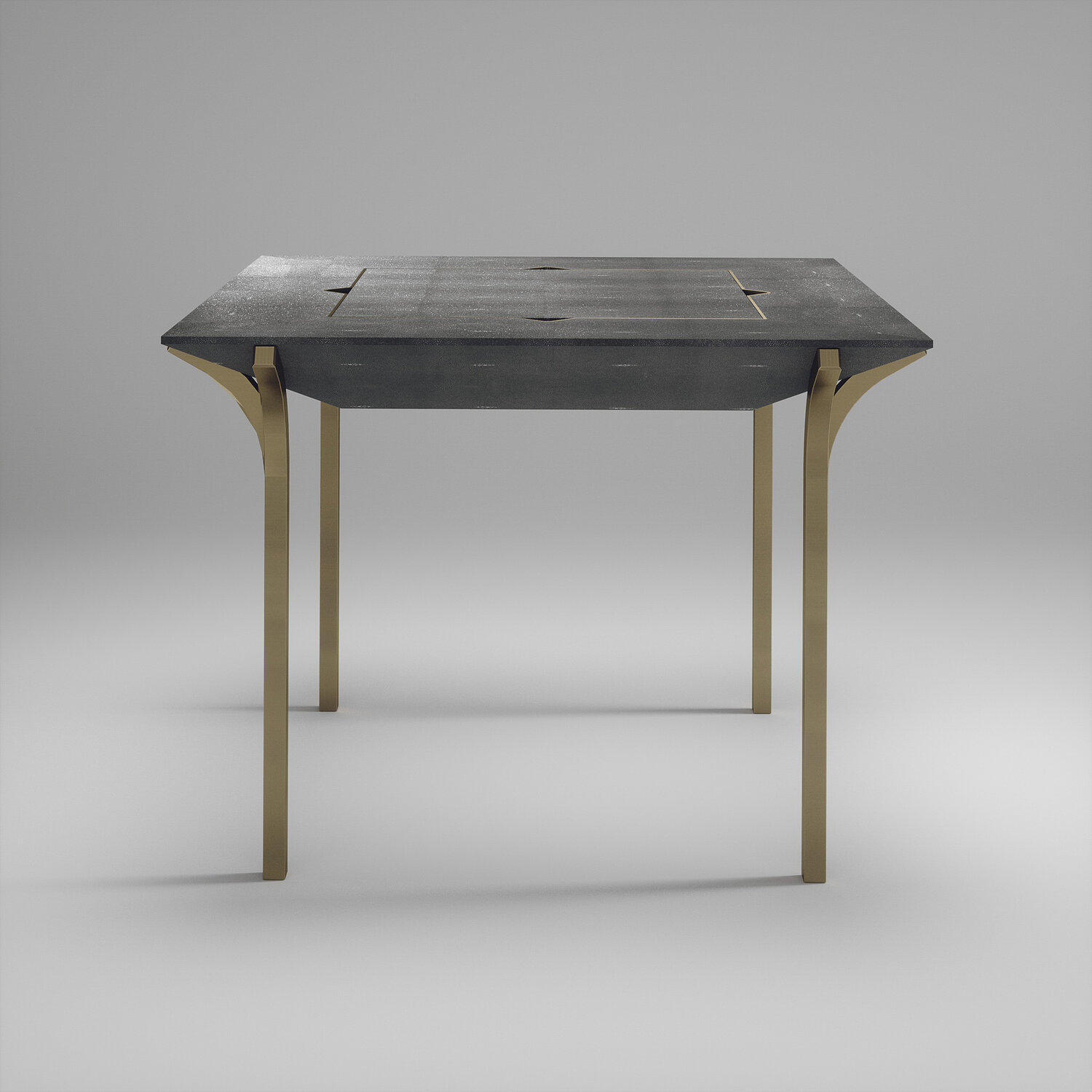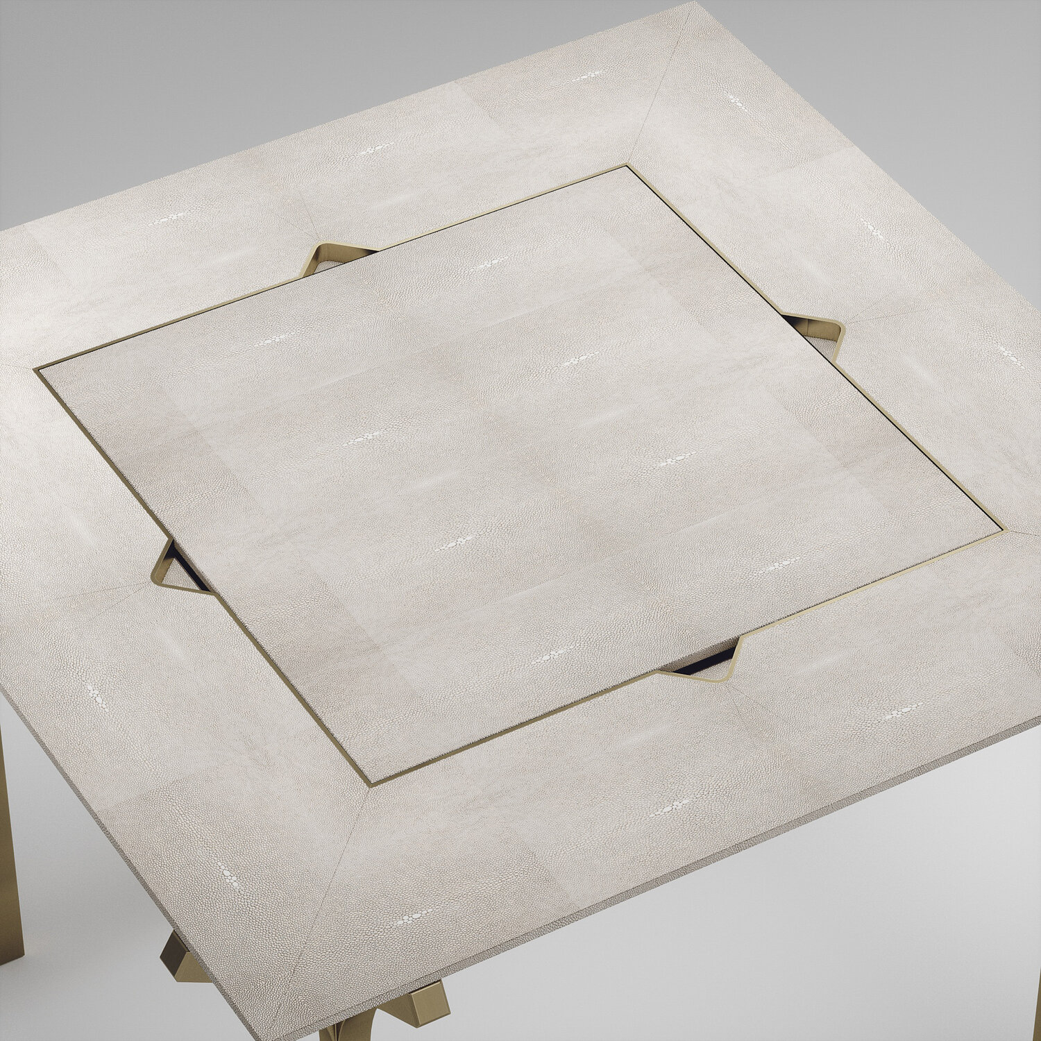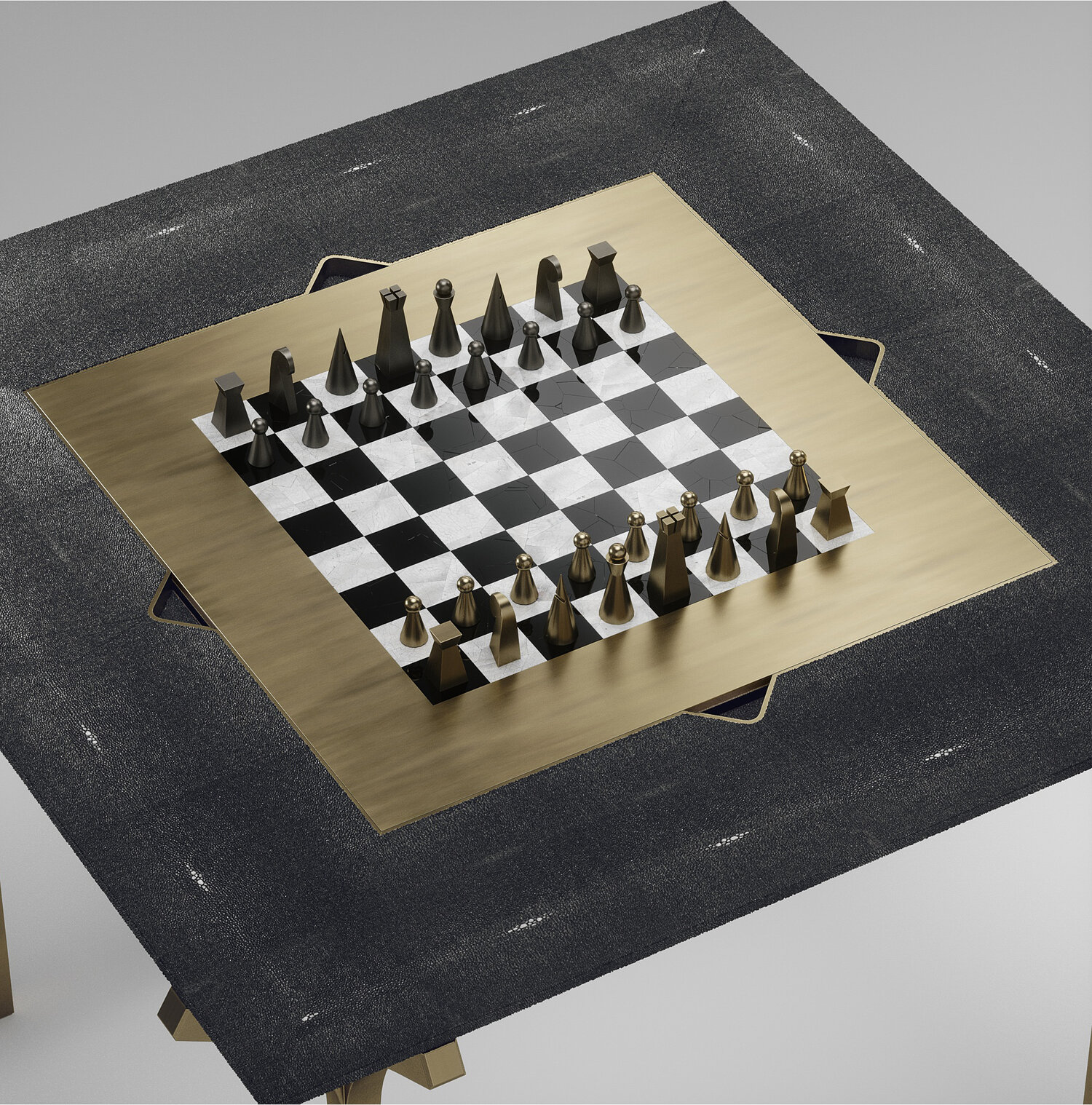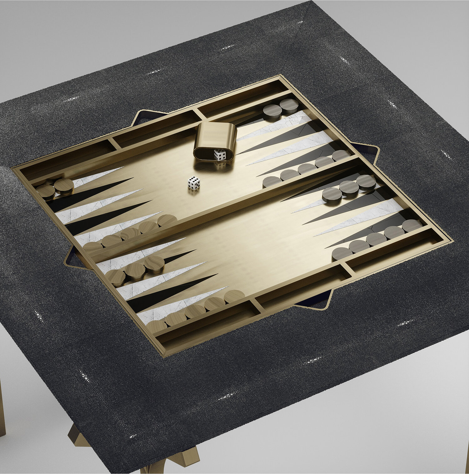 The 4 in 1 Marcel game table R&Y Augousti is a truly luxurious statement piece for your home. The clean lines of the overall piece in cream shagreen, accentuated by the sculptural and sleek bronze-patina brass legs make it versatile for any space. This piece includes a complete game package set with interchangeable boards that stack on top of each other in the centre of the table; one for chess, one for backgammon, a green velvet bard to play your favourite card games and a plain shagreen board if one were to use it as a beautiful centre piece.