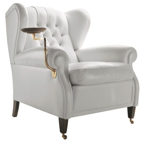 Poltrona Frau的這把1919沙發椅,洛可可的華麗造型,首先就顯得吃瓜群眾品味不俗,椅背兩側的耳朵形靠枕,填充了足夠泡泡紗的扶手,貼合身體又柔軟舒適,尤其側面貴族范兒十足的黃銅支架實木托盤,上面放杯咖啡的話,這熱鬧看得不能更愜意。